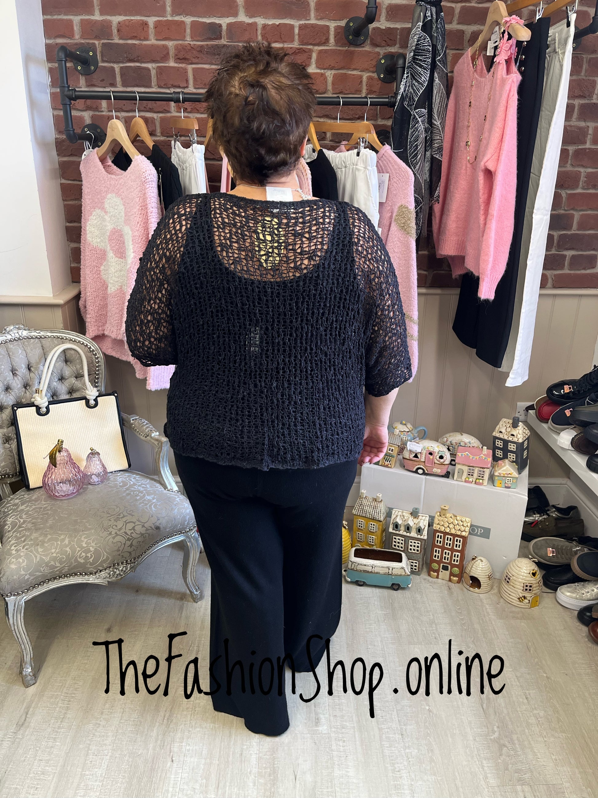 A timeless black layering piece that brings texture and polish to every outfit. The popcorn open-knit fabric adds subtle visual interest while remaining lightweight enough to wear across seasons. Designed to pair beautifully with everything in your wardrobe, this top elevates casual looks and pairs effortlessly with more tailored pieces for cooler days.