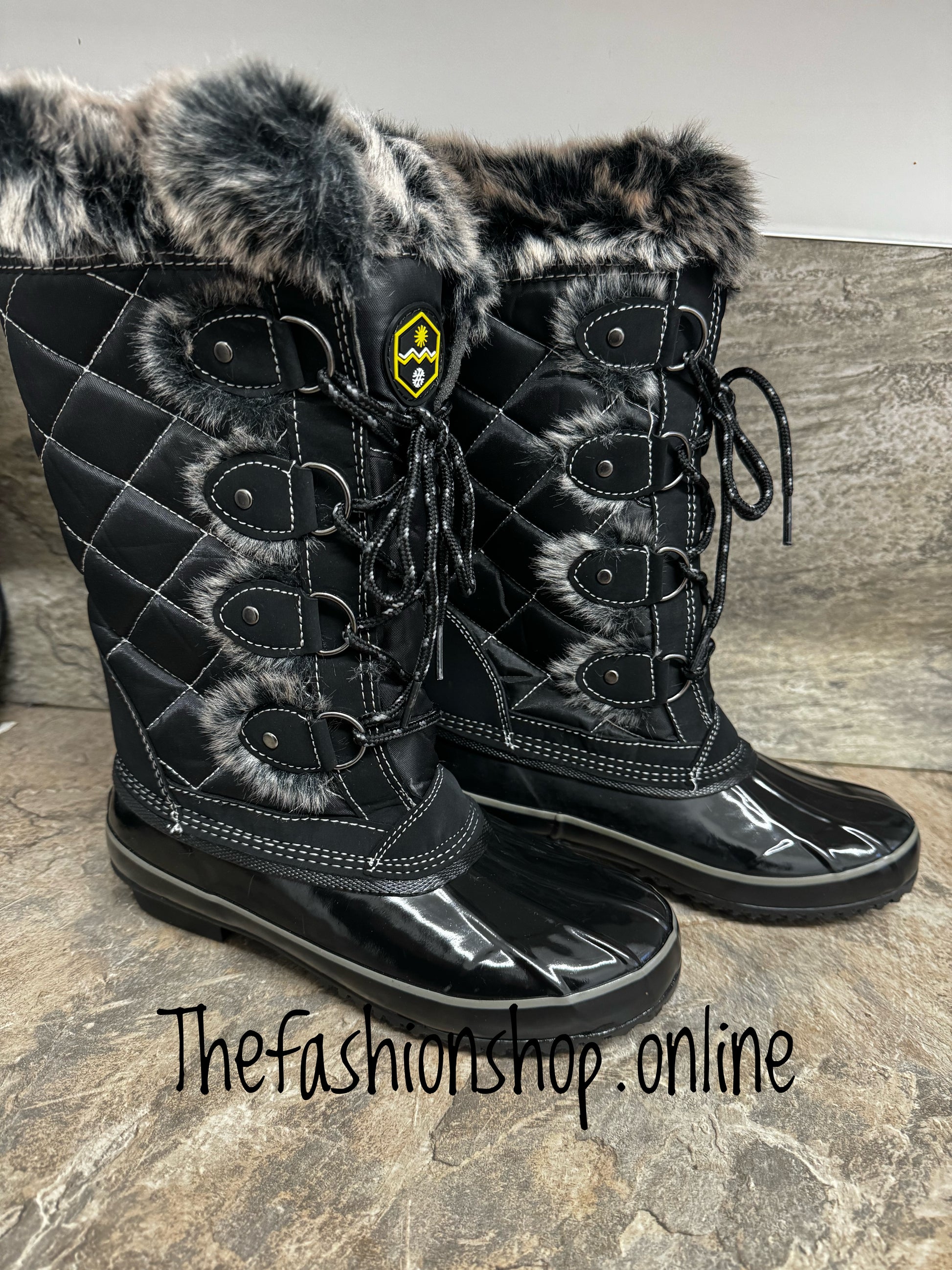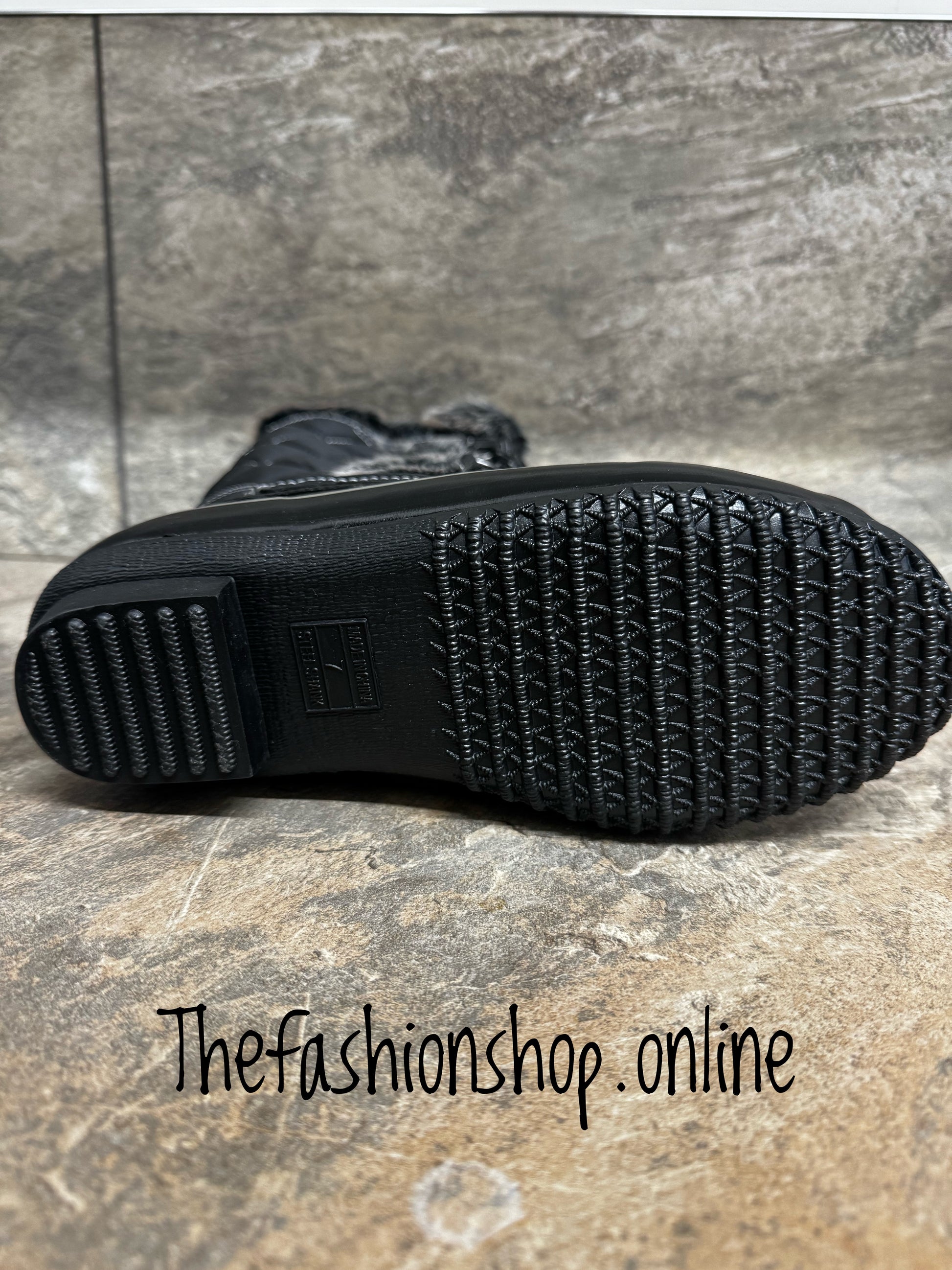 These fabulous quilted boots have a faux fur trim and are fleece lined for cosy legs and feet. The front part has a patent finish and will keep the rain at bay! Great dog walking boots.