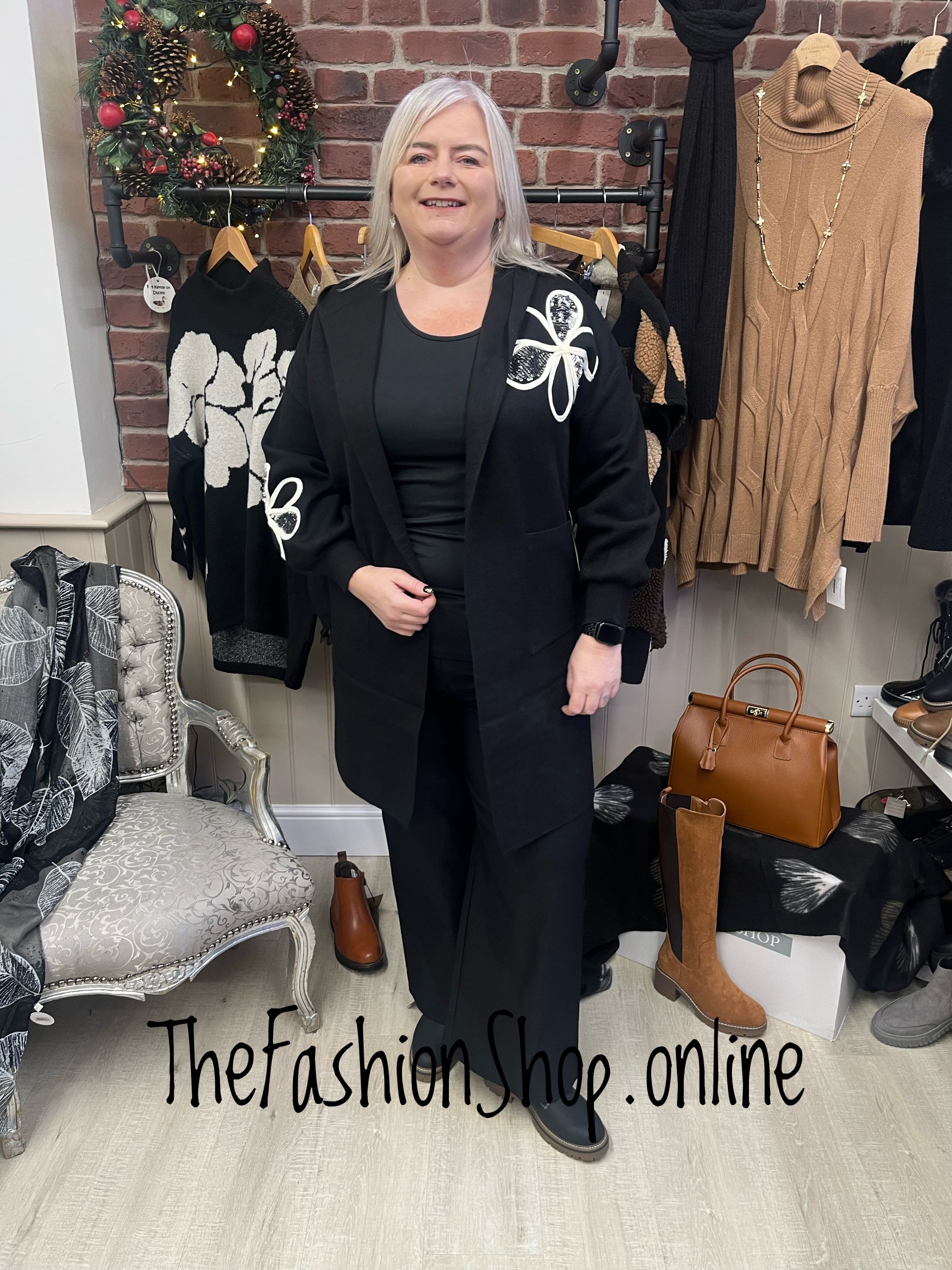 Elevate your layering game with this versatile black hooded coatigan, expertly designed for sizes 12-18. The relaxed silhouette offers effortless styling versatility with an edge to edge finish—wear it as a lightweight jacket over everyday outfits or as a cosy layer during transitional seasons. The large cream flower across the front has beautiful stylish silver sequins and this is repeated on the opposite sleeve for a touch of elegance. It is a hooded design, perfect for this time of year while the classic black tone complements any wardrobe. Crafted for all ages, this piece combines comfort with understated sophistication, making it an essential addition to any winter wardrobe.