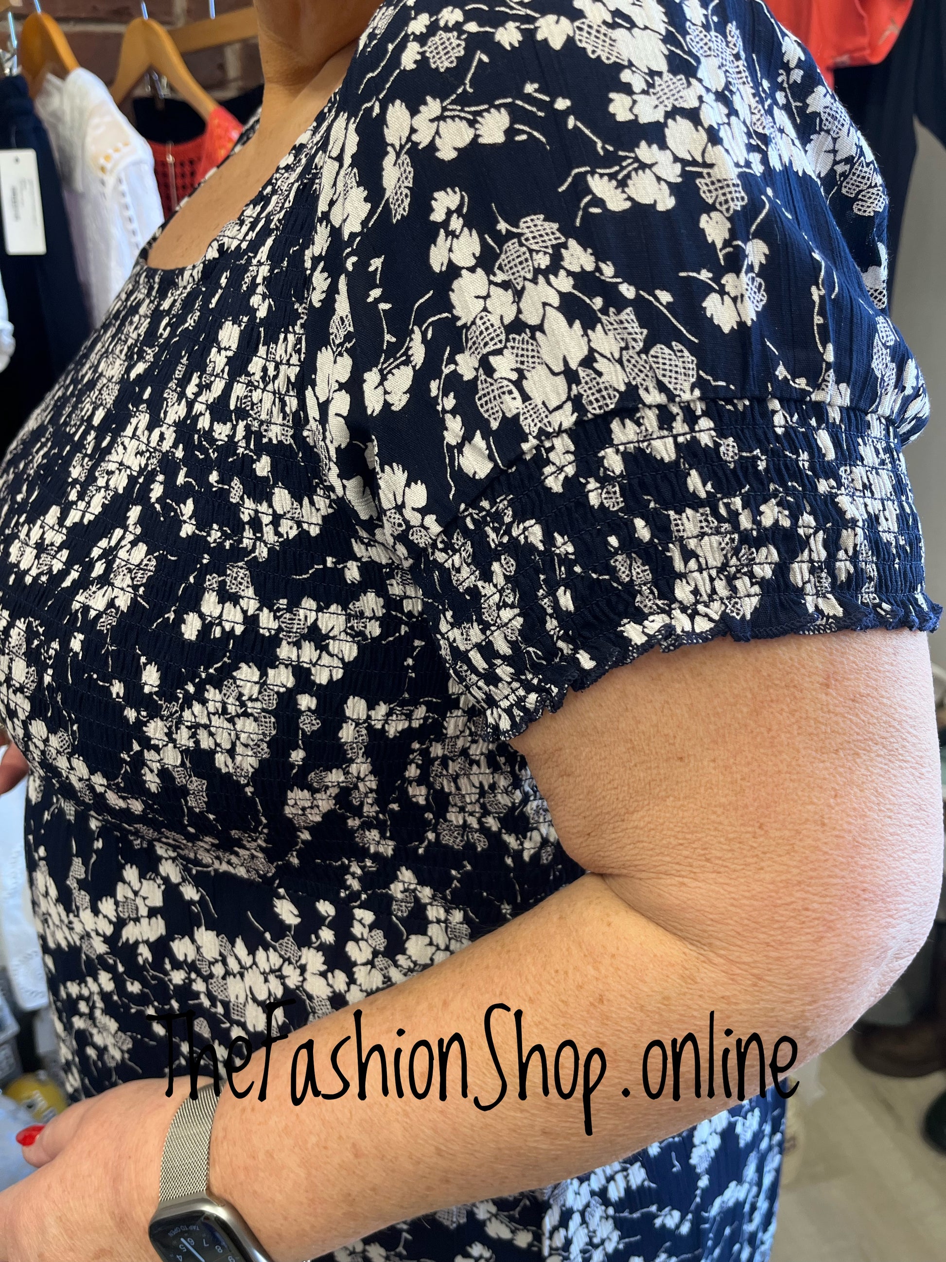 The Lexi navy printed summer dress is a garment designed for the modern woman who values style and comfort. Available in sizes 10-18, it combines a flattering shirred bust with a pretty floral print in navy and off white for versatile, everyday elegance. The square neckline is super flattering when on, giving shape and enhancing the whole look.