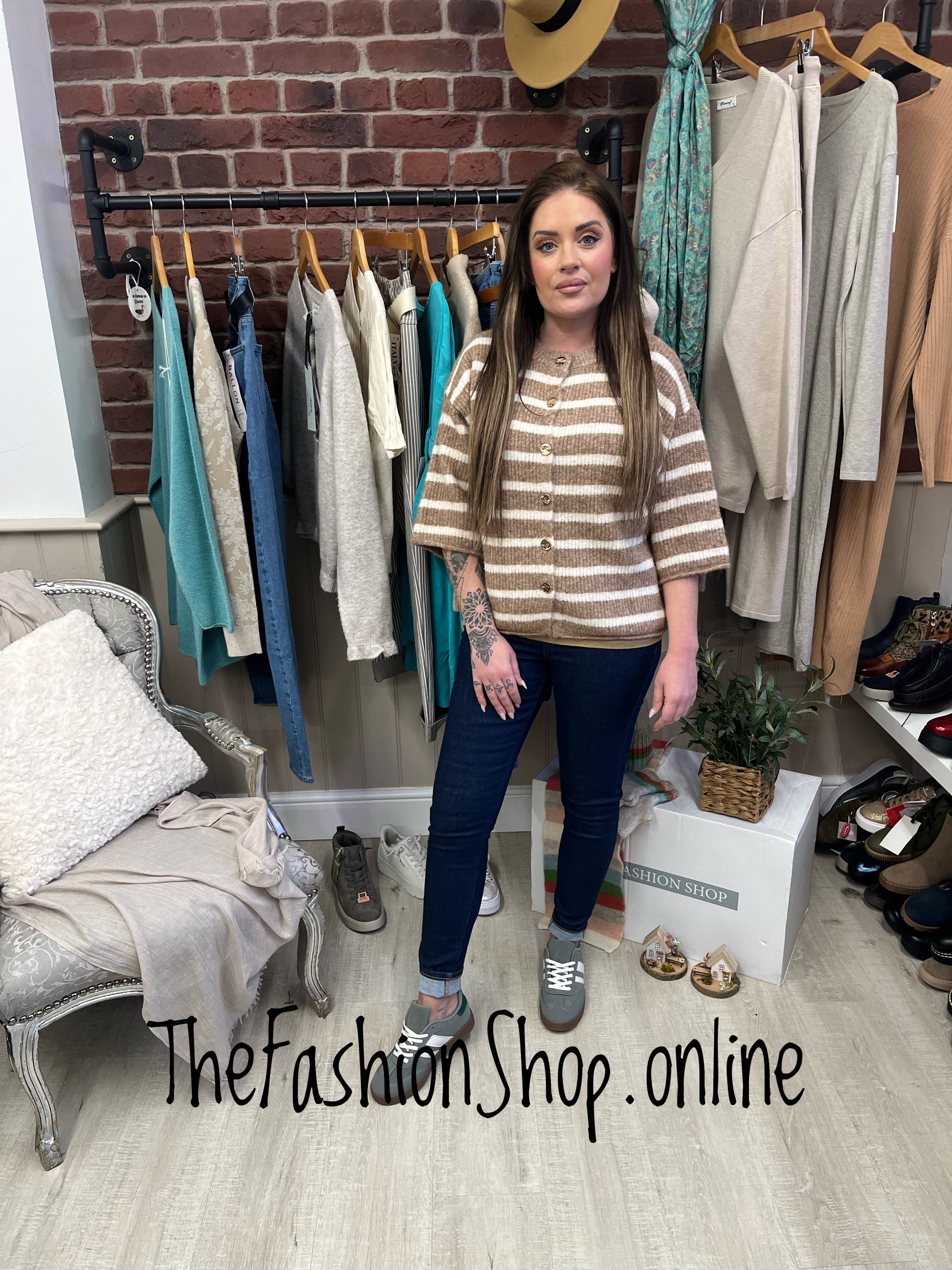 - Refined details: camel tones paired with a classic stripe and 3/4 length sleeves, finished with stylish gold hammered buttons for a subtle, upscale touch.