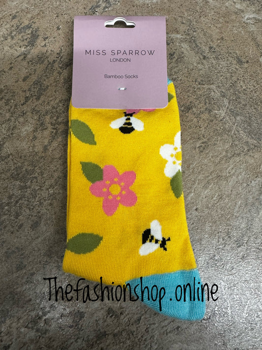 Miss Sparrow Yellow Bees and Flowers Bamboo socks 3-7
