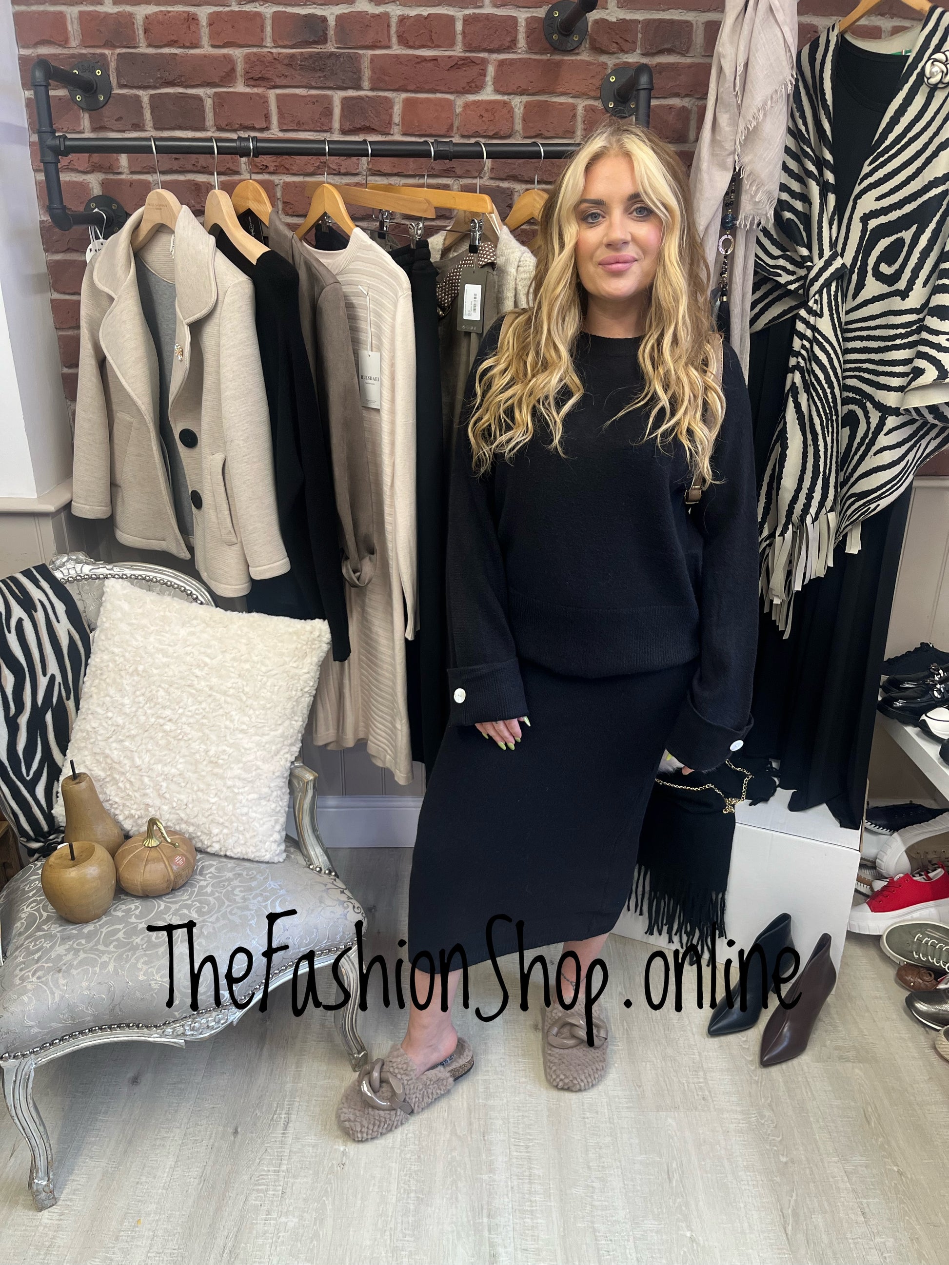 Elevate your essentials with the Andrea Black skirt co-ord. The knitted pencil skirt is crafted to sit smoothly on the body, while the jumper is more boxy offering a flattering silhouette in a versatile grey palette.
