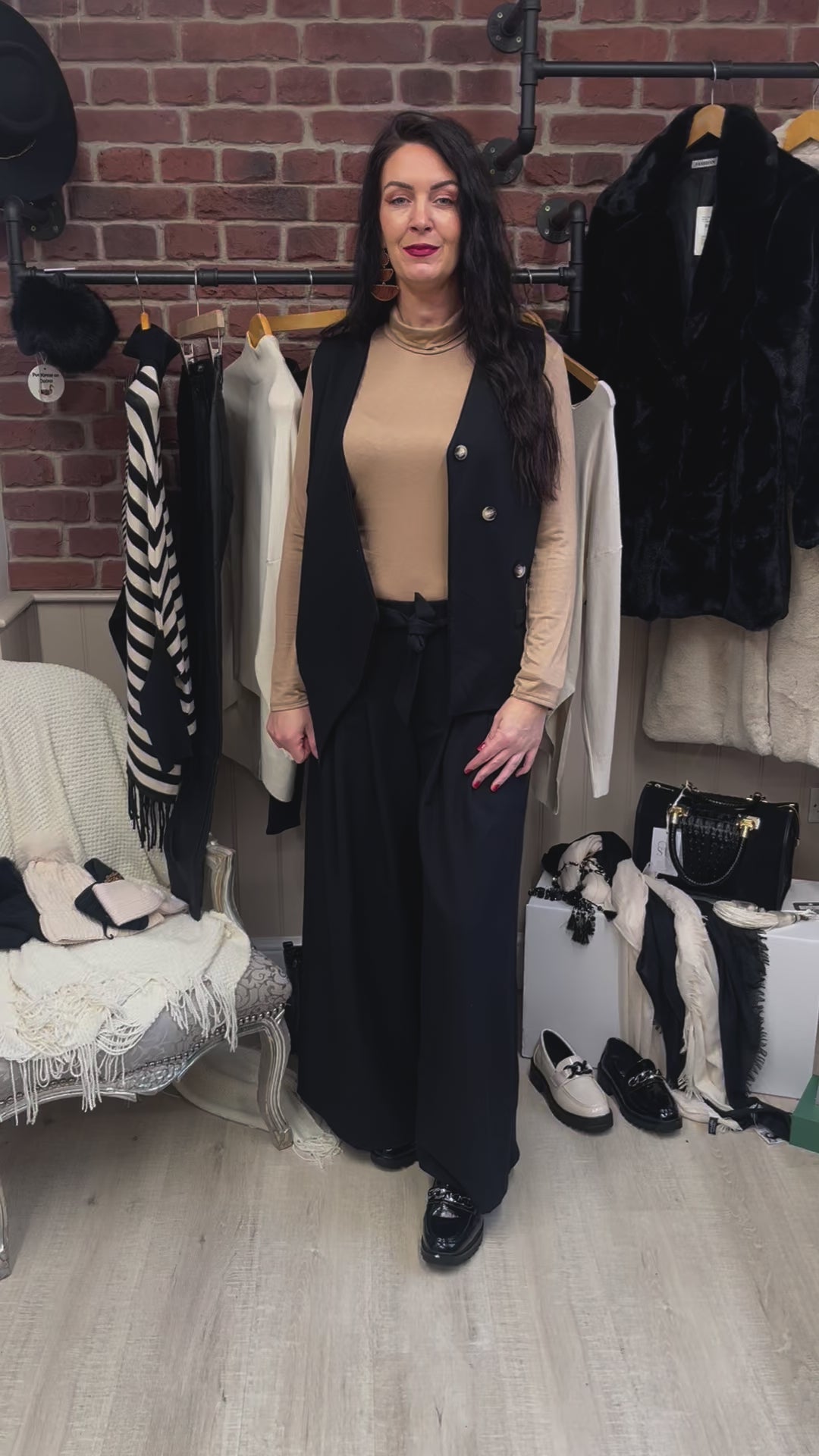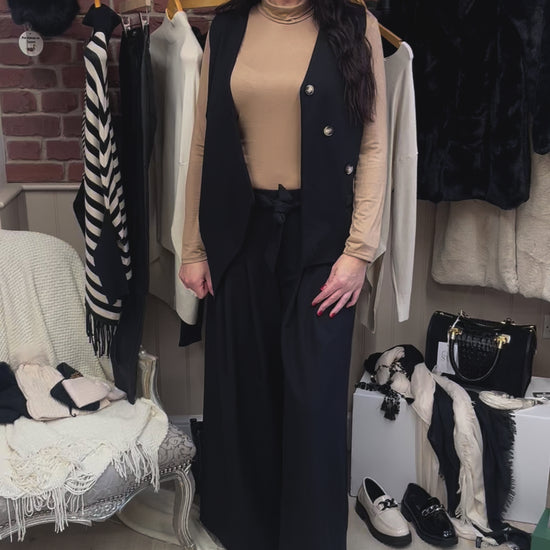 This stylish waistcoat in black makes a great transitional piece. It has three tortoiseshell buttons running diagonally across the front and a funky asymmetric hem line at the front. The scuba material gives it a lovely tailored look and dressed up or down, is a fabulous Autumnal addition to your wardrobe.