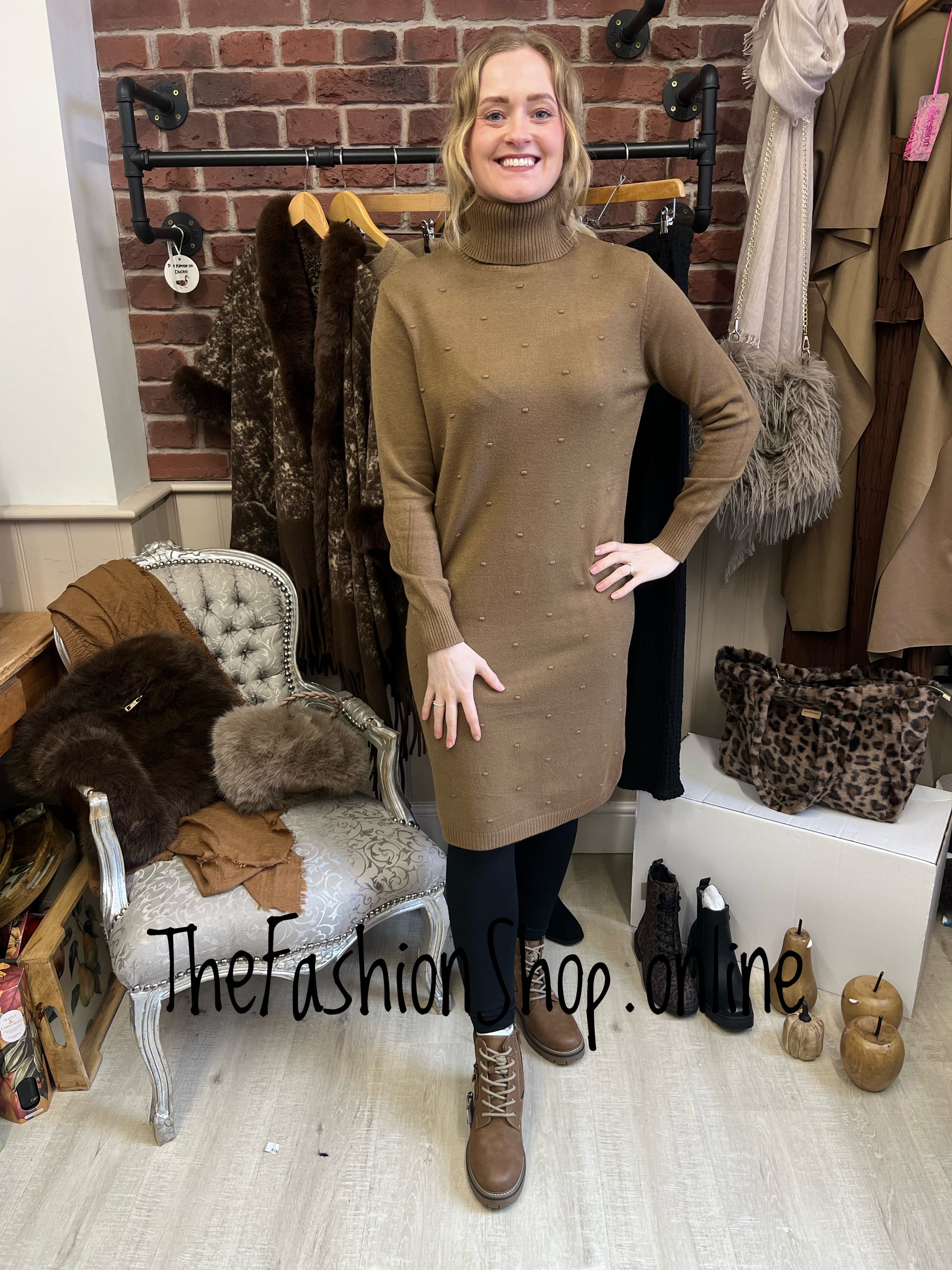 The Charlotte camel jumper dress offers a refined blend of comfort and timeless style. Crafted from soft, high-quality fabric, it ensures warmth and ease of movement, making it ideal for cooler seasons. Its rich camel tone provides versatile pairing options, suitable for both casual wear and layered looks. Designed to flatter all figures, this jumper dress combines practicality with understated elegance for a sophisticated everyday wardrobe staple. It has a soft ribbed polo neck that matches the hem line and cuffs perfectly. The subtle dot work makes a wonderful finish.