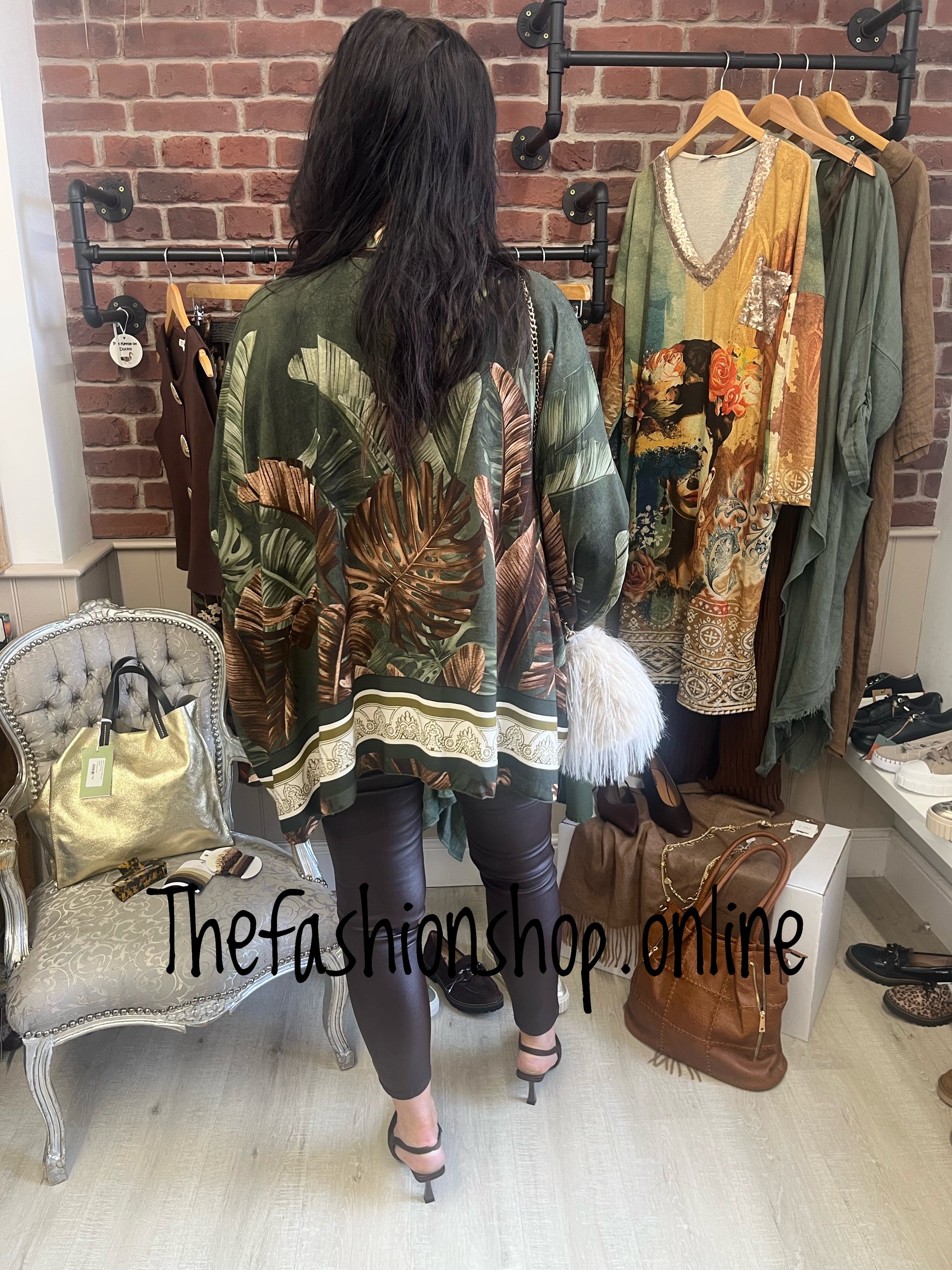 Introducing the Kara Khaki Dipped Hem Leaf Shirt, crafted for sizes 8-18. This top blends contemporary style with everyday comfort, featuring a distinctive dipped hem and a leaf-inspired print in khaki green and rich brown.