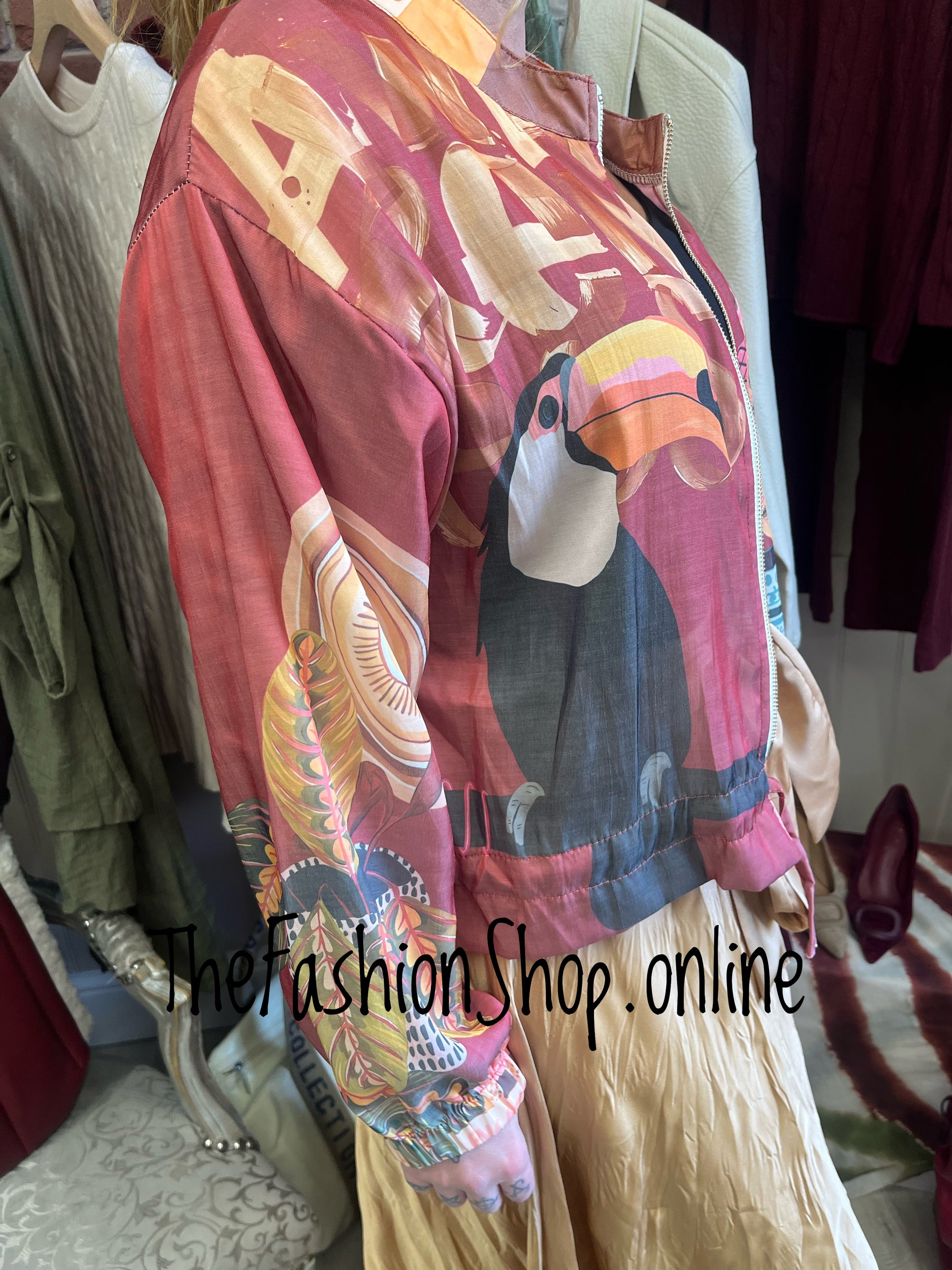 From The Fashion Shop, the Phoebe Lightweight Jacket offers a refined layer for transitional weather. Crafted from breathable fabric, it delivers comfort without bulk, making it suitable for both casual days and dressier occasions. The rich wine shade enhances any outfit, with it's beautifully bold toucan and cactus print.
