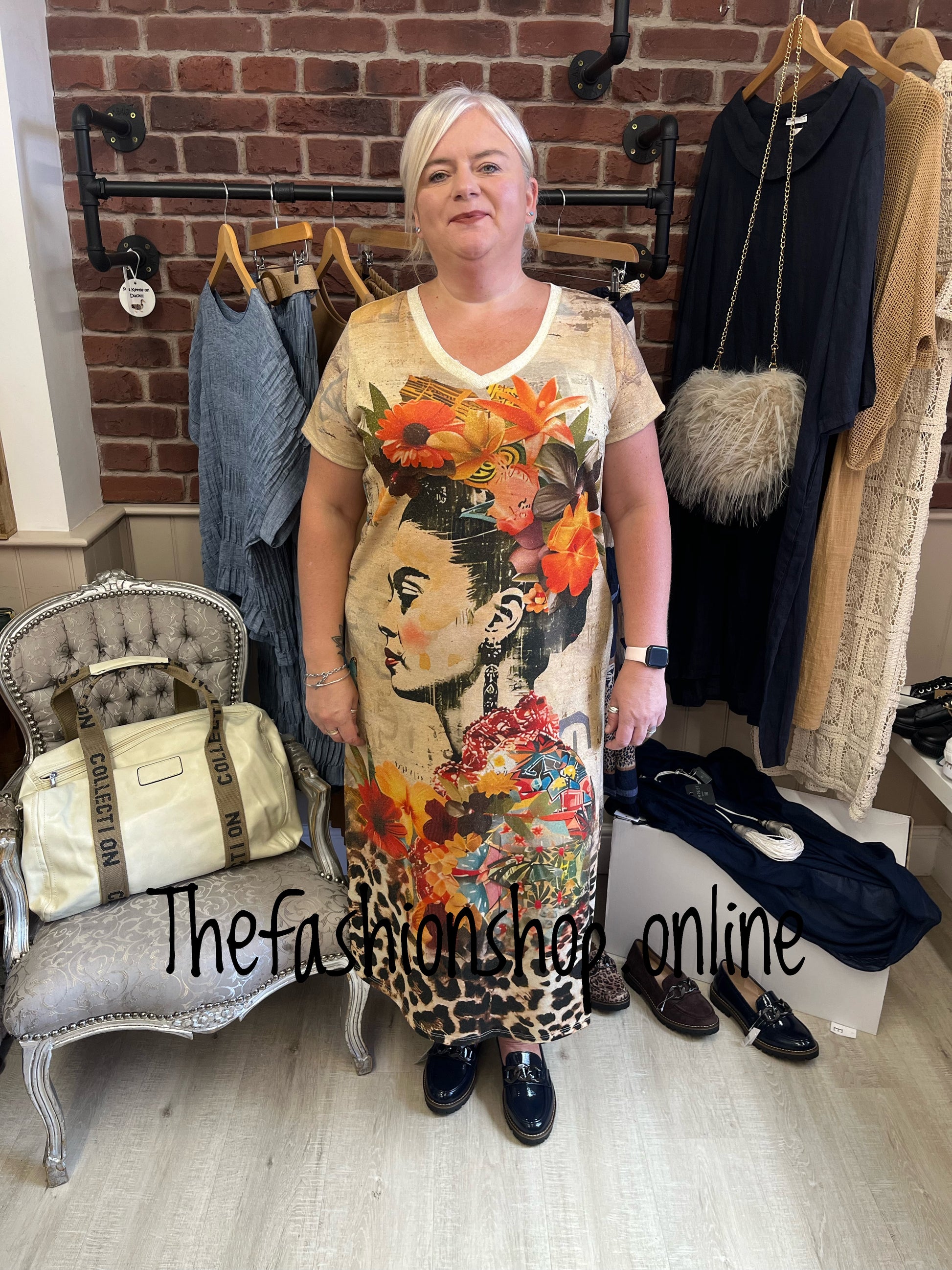 Measuring 51" from shoulder to hem and 48" across the bust, this dress offers a flattering fit for a variety of body shapes. The artistic portrait design draws the eye, complemented beautifully by a display of colour and leopard print along the hem line. The subtle shimmer adds an extra touch of elegance, ensuring you stand out at any occasion.
