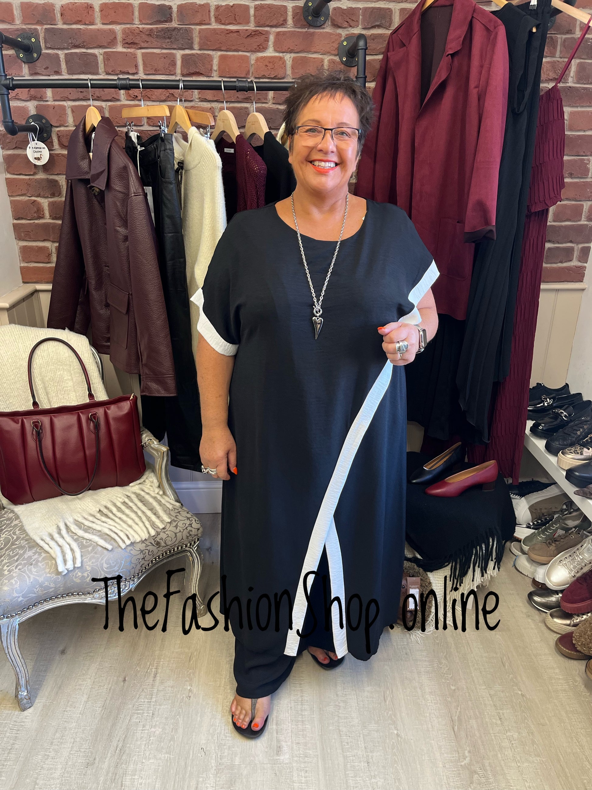 This beautiful classic two piece trouser set is a real statement outfit and looks striking with white or a pop of colour. The trousers are a wide leg with a fully elasticated waistband and tie waist and have a 26.5" inside leg with a low rise. The beautiful drape top crosses over itself for an elegant and stylish look and measures 55" from shoulder to hem line.