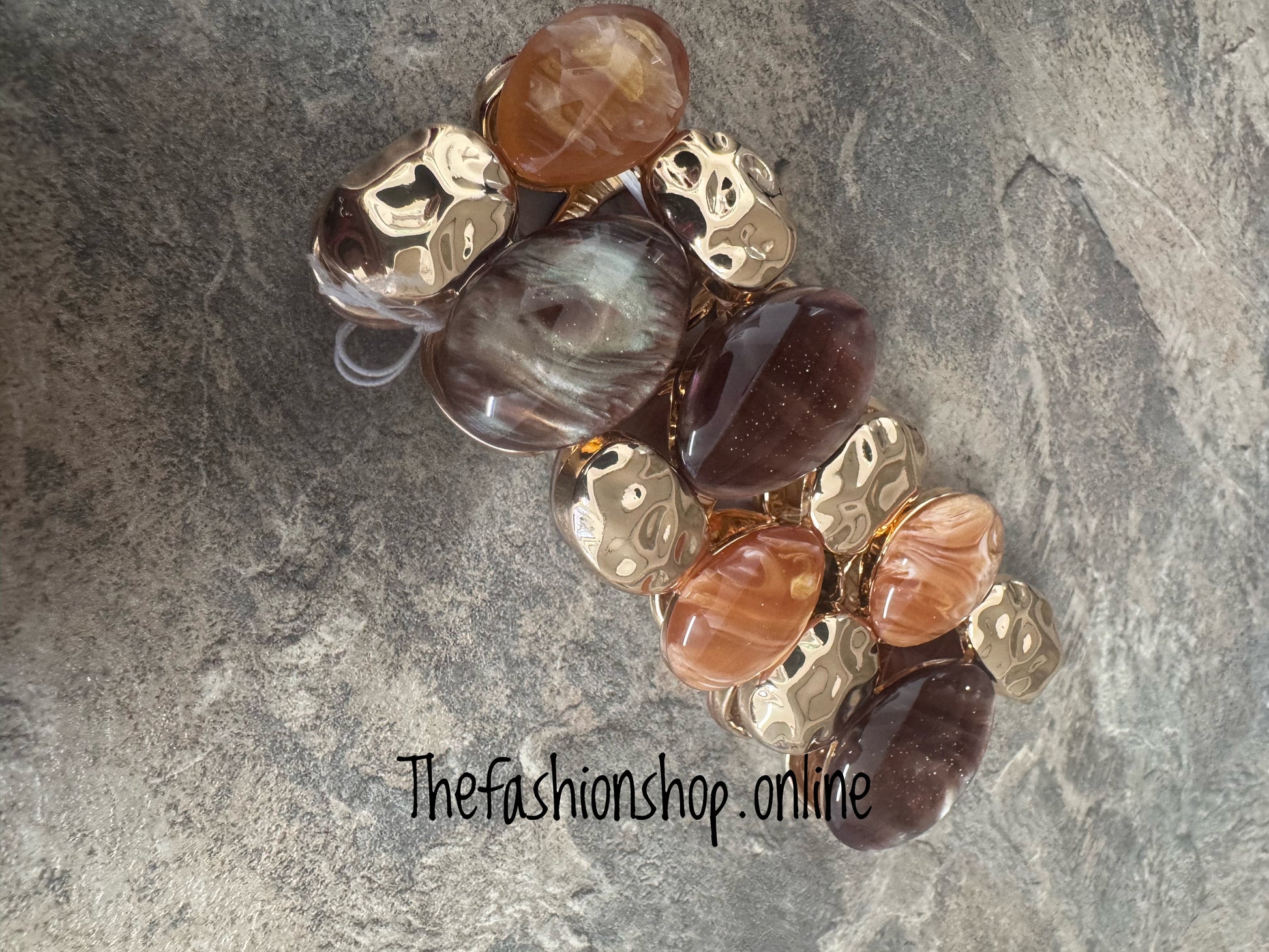 The Andara and Gold Bracelet features sections of gold brown and mink gems delicately strung on an elasticated band. This design ensures a comfortable fit while showcasing the natural beauty of each gem. Ideal for those seeking a refined accessory that combines elegance with ease of wear.
