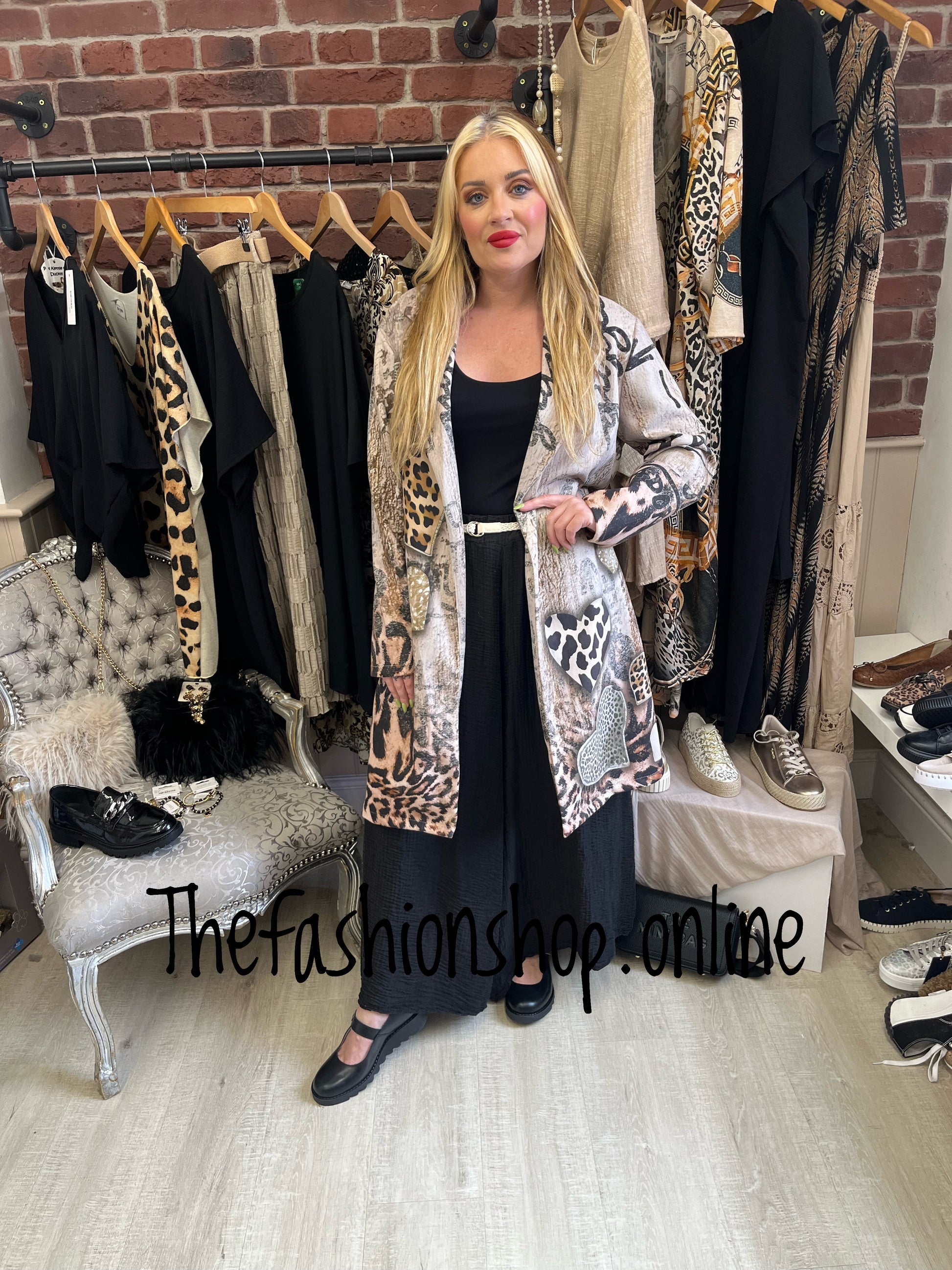 The Carmen Graffiti Heart Duster Jacket combines timeless style with versatile layering. Its lightweight fabric and relaxed fit make it ideal for transitioning between seasons, providing subtle warmth without bulk. The animal print heart motifs and graffiti detailing add a distinctive touch, elevating your outfit with a refined, expert-crafted detail. Perfect for both casual and smart-casual looks, this duster jacket enhances your wardrobe with effortless elegance and comfort.