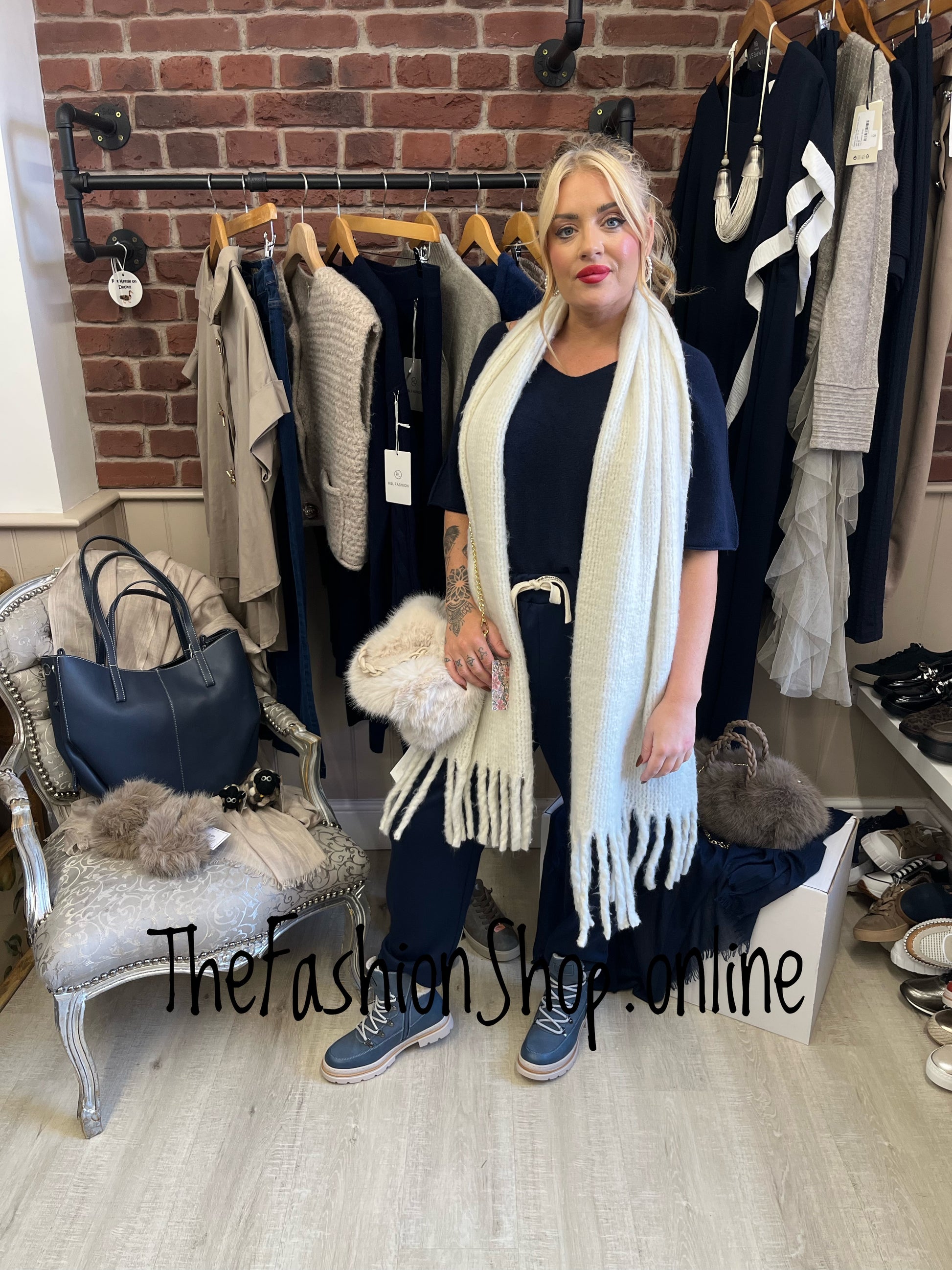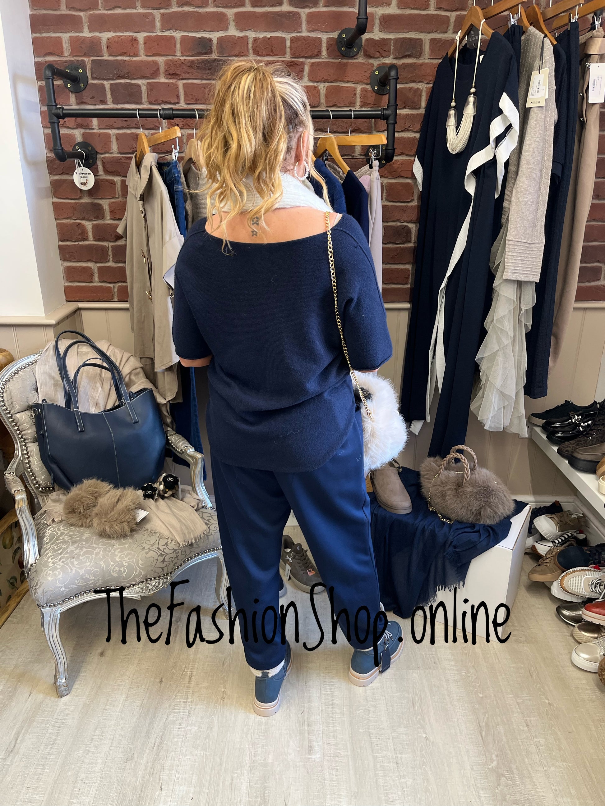 This beautifully soft navy knitted top makes a wonderful transitional piece for cooler days. It features a soft V-neckline and long sleeves with generous length, perfect for layering under jackets, cardigans, or outerwear while keeping you comfortable throughout the season.