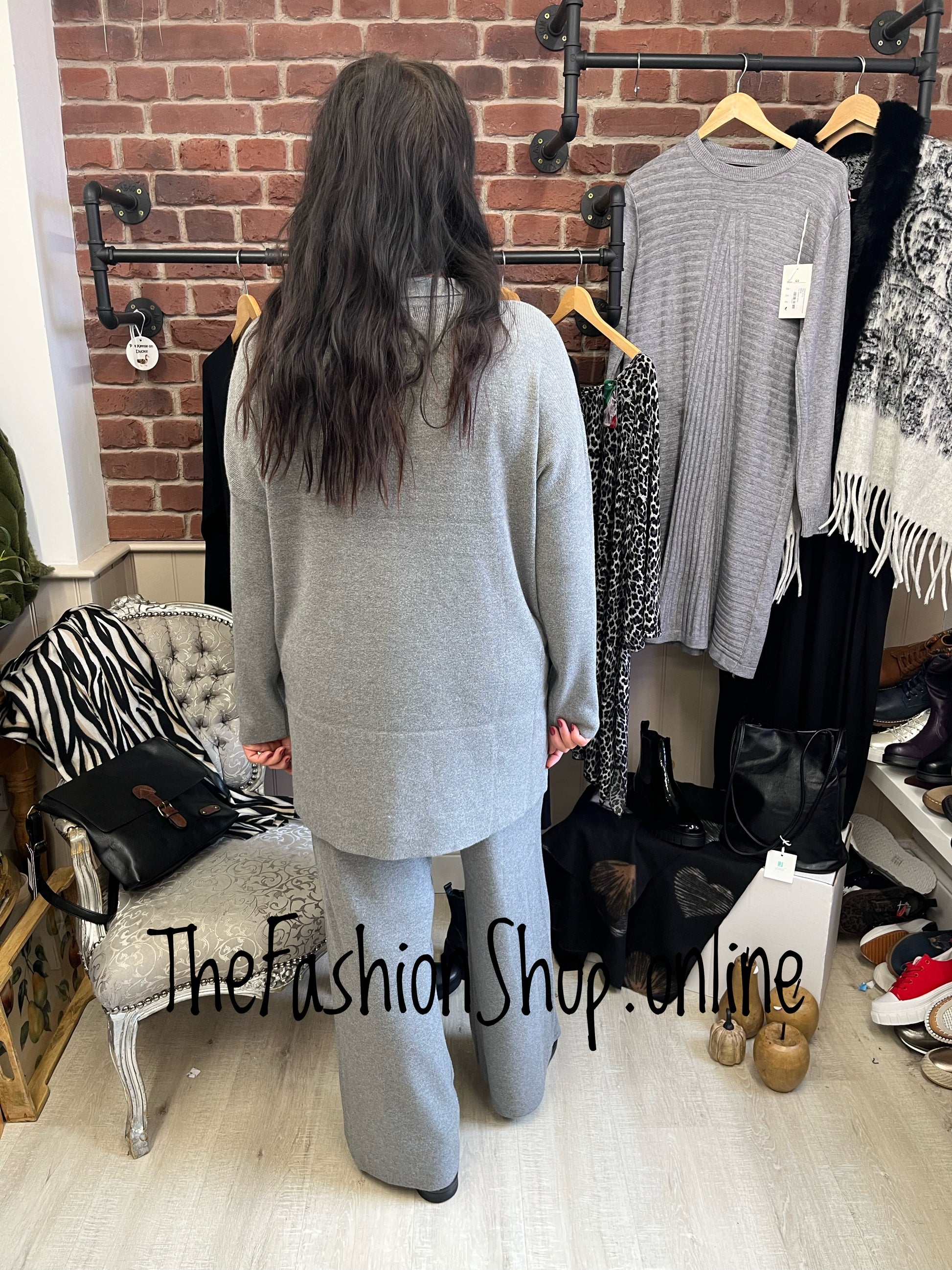 The Lara grey co-ord set offers a versatile and sophisticated look. Crafted with quality materials, this set combines comfort with contemporary style, making it ideal for both casual and professional settings. Its coordinated pieces ensure effortless outfit coordination while providing a flattering fit across the available size range. Perfect for those seeking a polished, cohesive wardrobe option. The trousers are wide leg with a fully elasticated waistband. The fine rib finish allows for both movement and comfort for when you're on the go. The jumper is ideal for layering and has a collared V neck line.