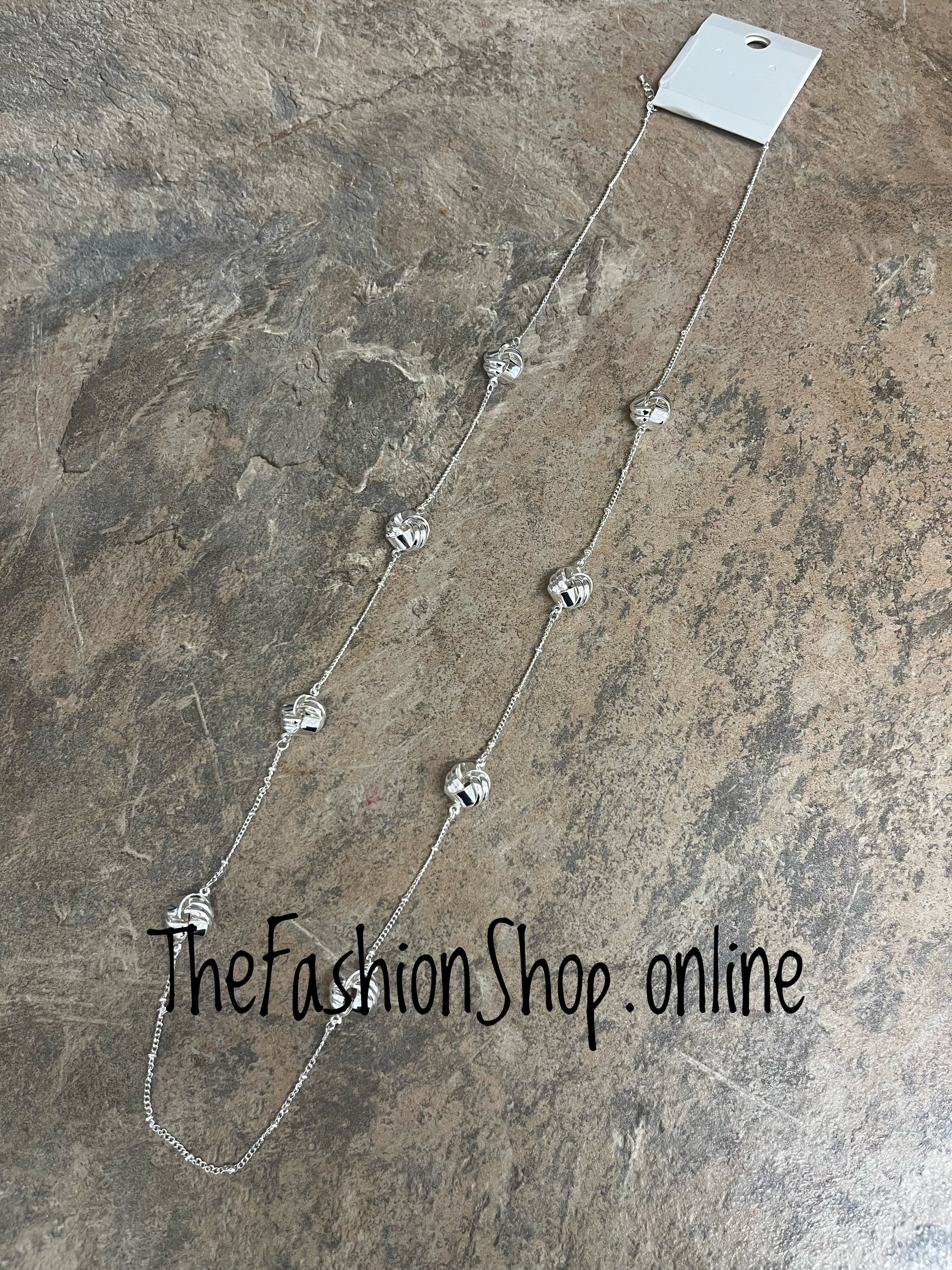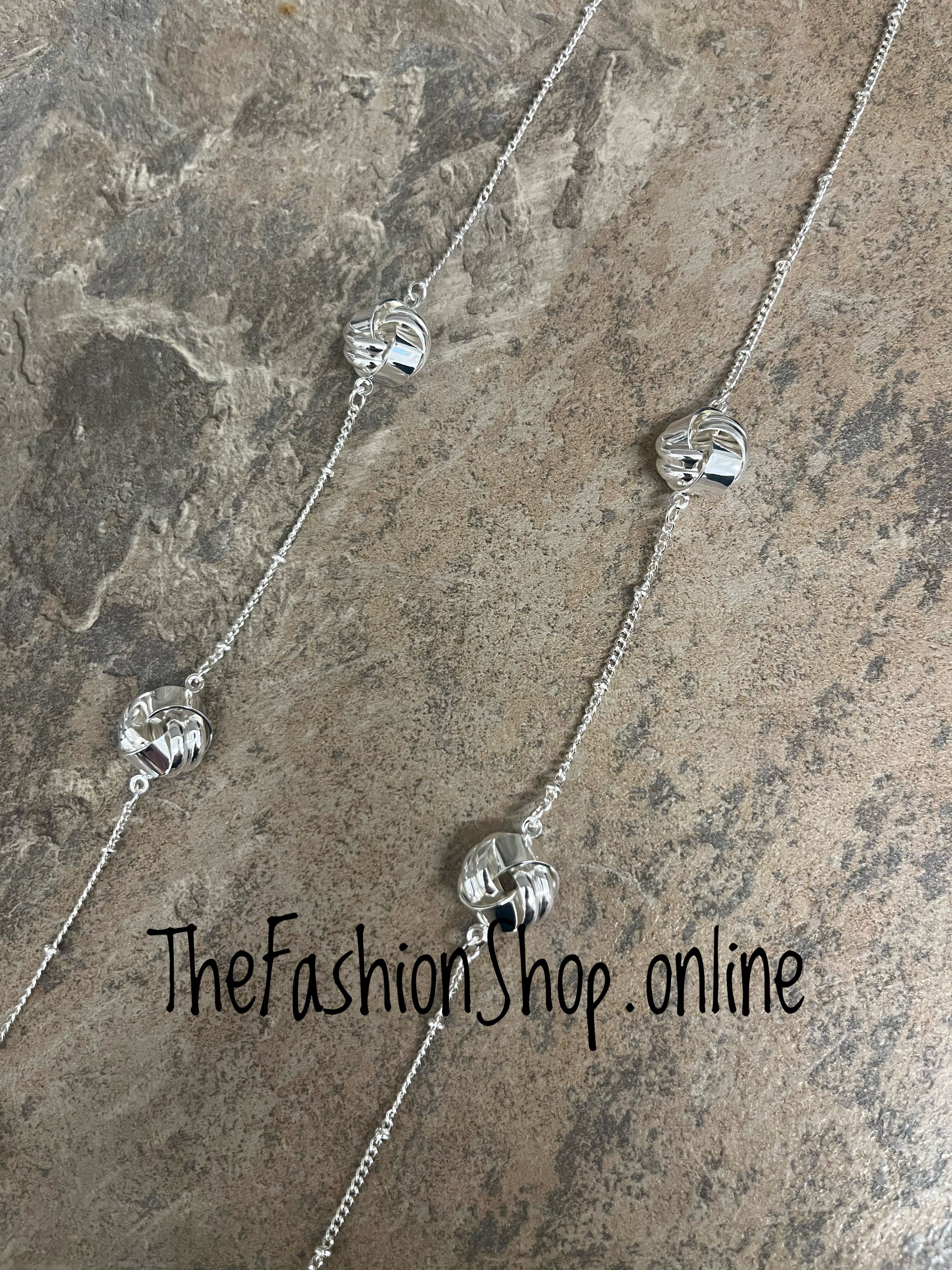 Elevate your accessory collection with this long silver knot necklace on a fine curb chain. Crafted to catch the eye, its intricate knot design offers a sophisticated yet versatile element, allowing seamless pairing with both casual and formal attire. The extended length enhances layering possibilities, making it a refined choice for those who appreciate expert craftsmanship and timeless style.
