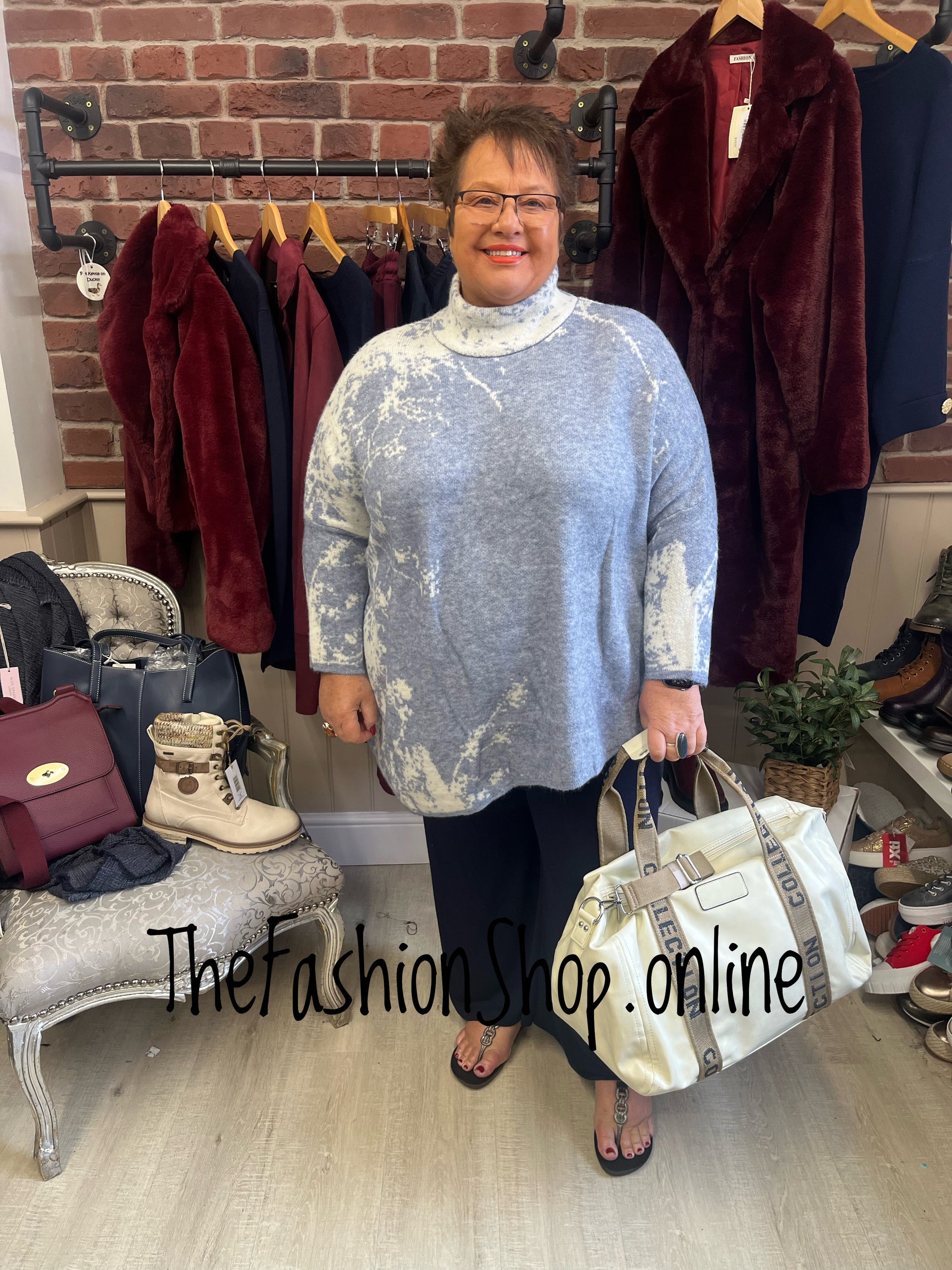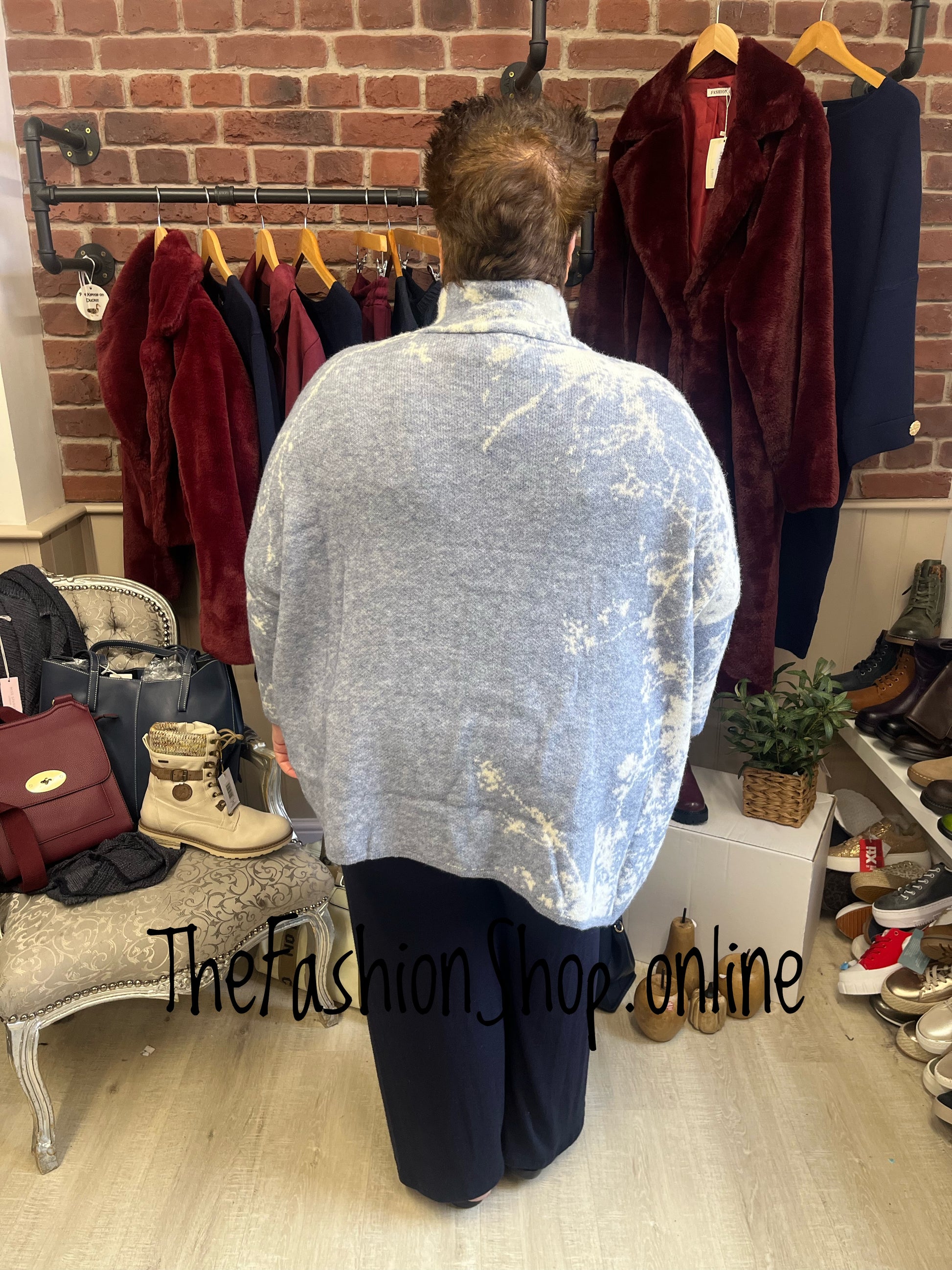 A gorgeous denim blue and cream patterned jumper by Sarah Tempest that will make a firm winter favourite! Cosy and warm, it has an asymmetric hem line and looks fantastic worn with slim fitting jeggings or jeans. It has a subtle turtle neck line and striking pattern. It measures 30" from shoulder to hem line at the shortest point and 38" at the longest, approx 52" across the bust.