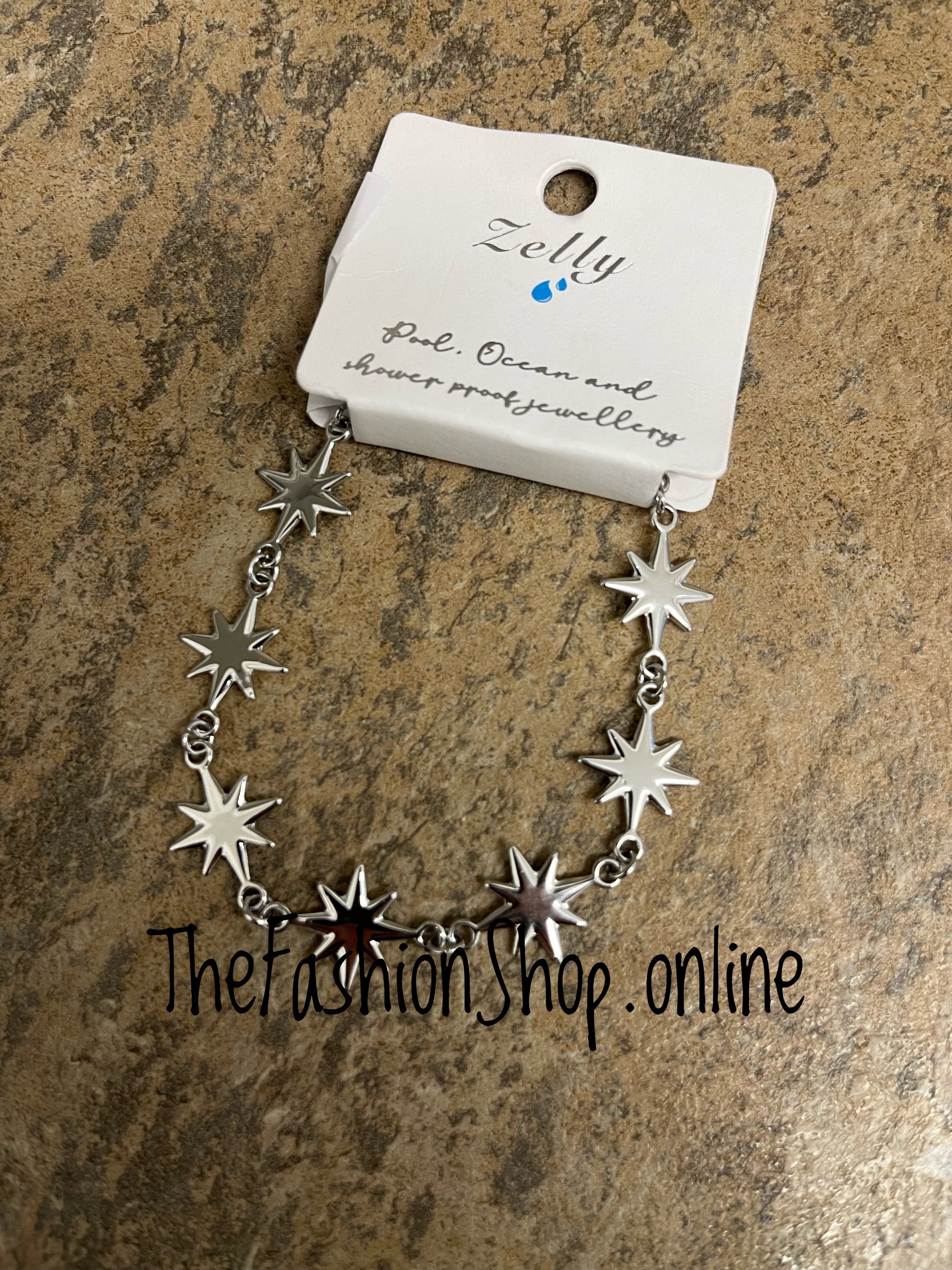 The Zelly Star Bracelet offers a refined, feminine touch that perfectly complements its matching necklace. Crafted to harmonize in style and elegance, this bracelet enhances your look with subtle star-inspired details, providing a cohesive accessory set that elevates any outfit with expert craftsmanship and delicate design. It measures 8" long.