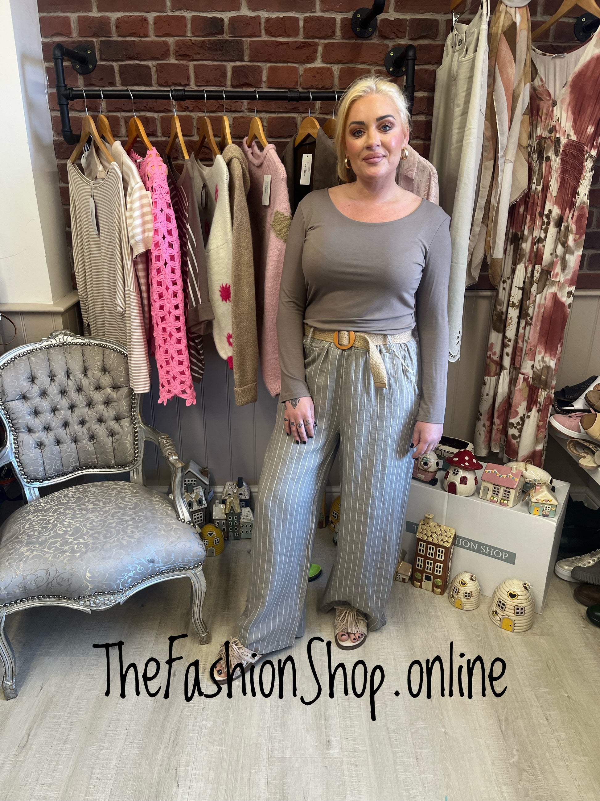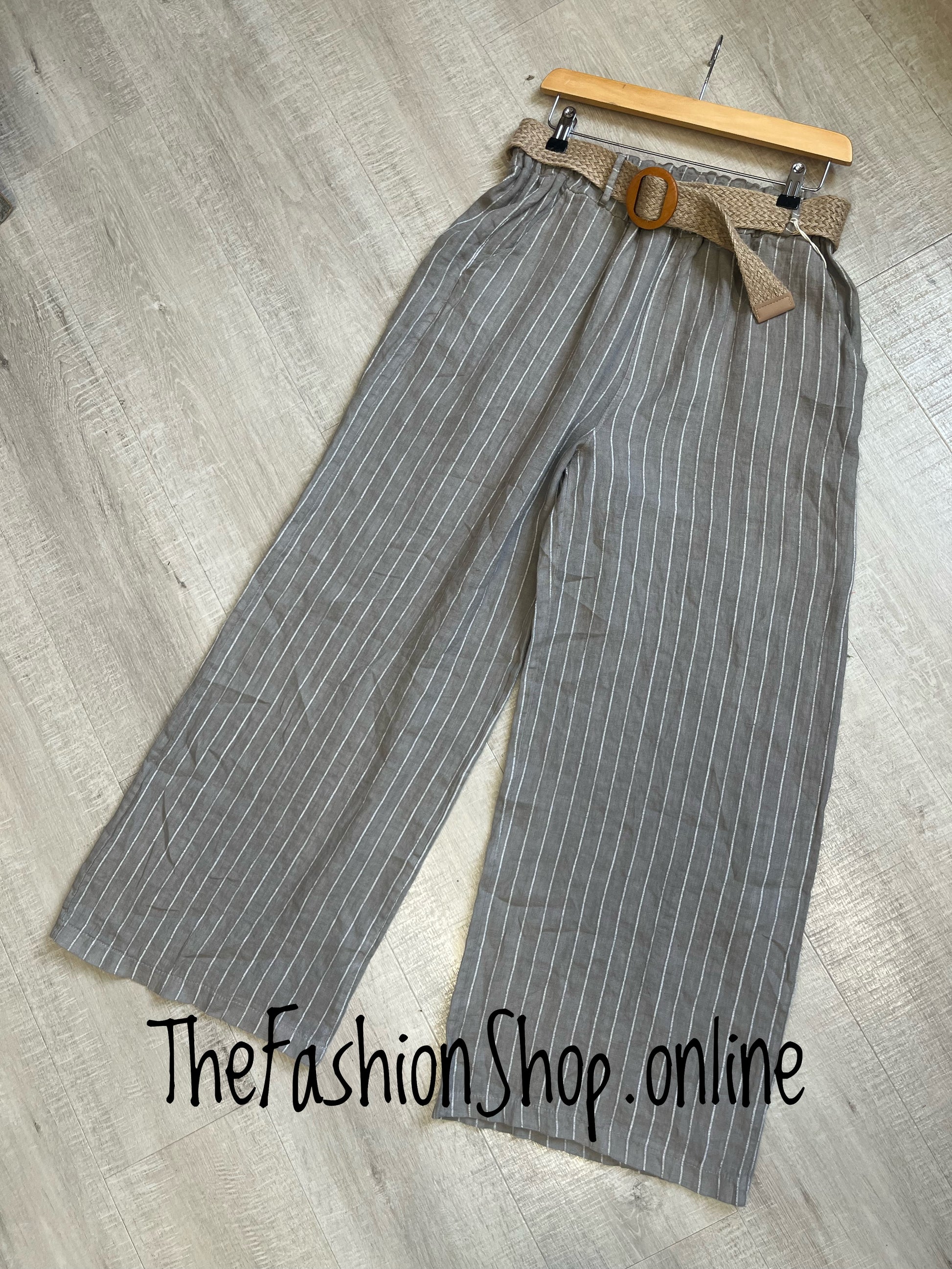 Meet the Bianca mocha striped linen trousers, a breezy essential for warm-weather wardrobes. Crafted from 100% linen, these trousers offer natural breathability and a soft, relaxed drape that moves with you all day long. The mocha stripe adds a refined touch that pairs effortlessly with neutral tops, making it easy to build outfits from desk to dinner without changing your look. The addition of the hessian belt adds tone and style.
