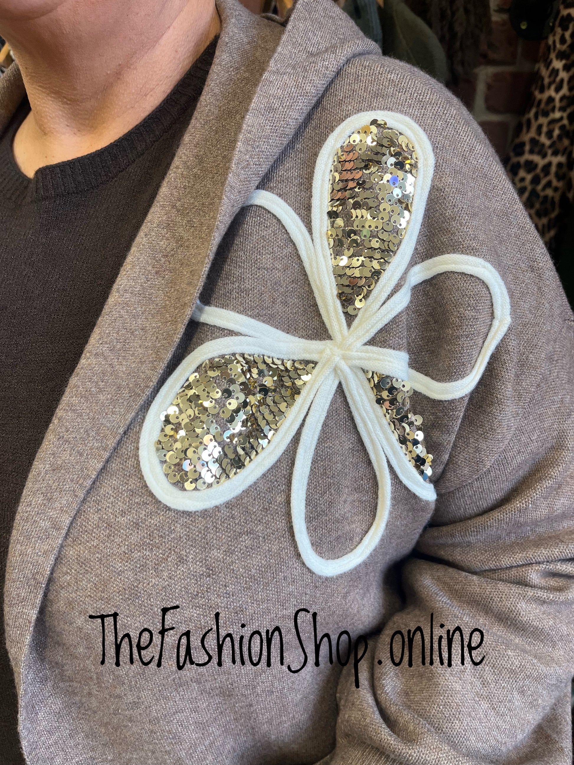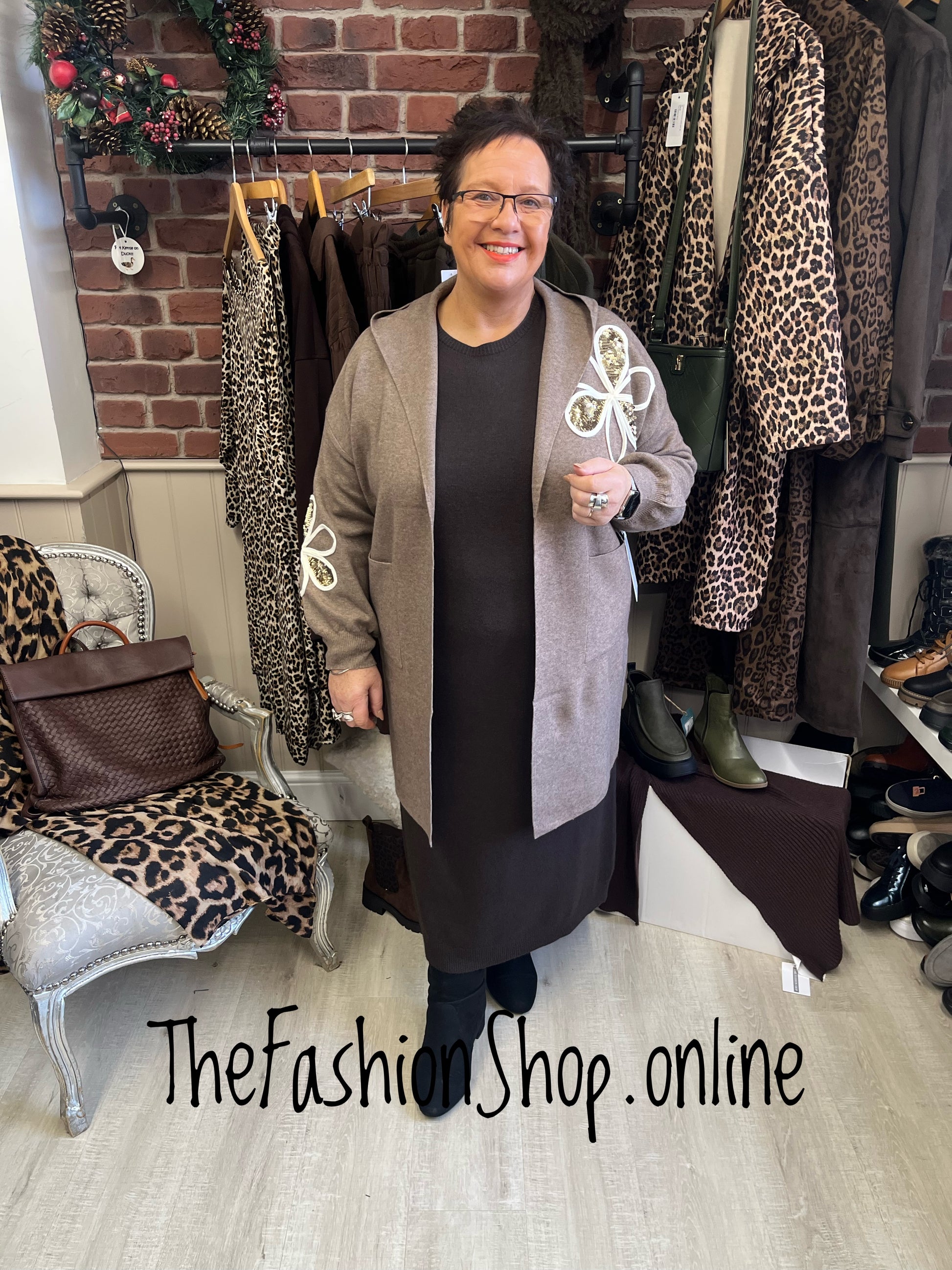 Elevate your layering game with this versatile coffee hooded coatigan, expertly designed for sizes 12-18. The relaxed silhouette offers effortless styling versatility with an edge to edge finish—wear it as a lightweight jacket over everyday outfits or as a cosy layer during transitional seasons. The large cream flower across the front has beautiful stylish gold sequins and this is repeated on the opposite sleeve for a touch of elegance. It is a hooded design, perfect for this time of year while the neutral coffee tone complements any wardrobe. Crafted for all ages, this piece combines comfort with understated sophistication, making it an essential addition to any winter wardrobe.