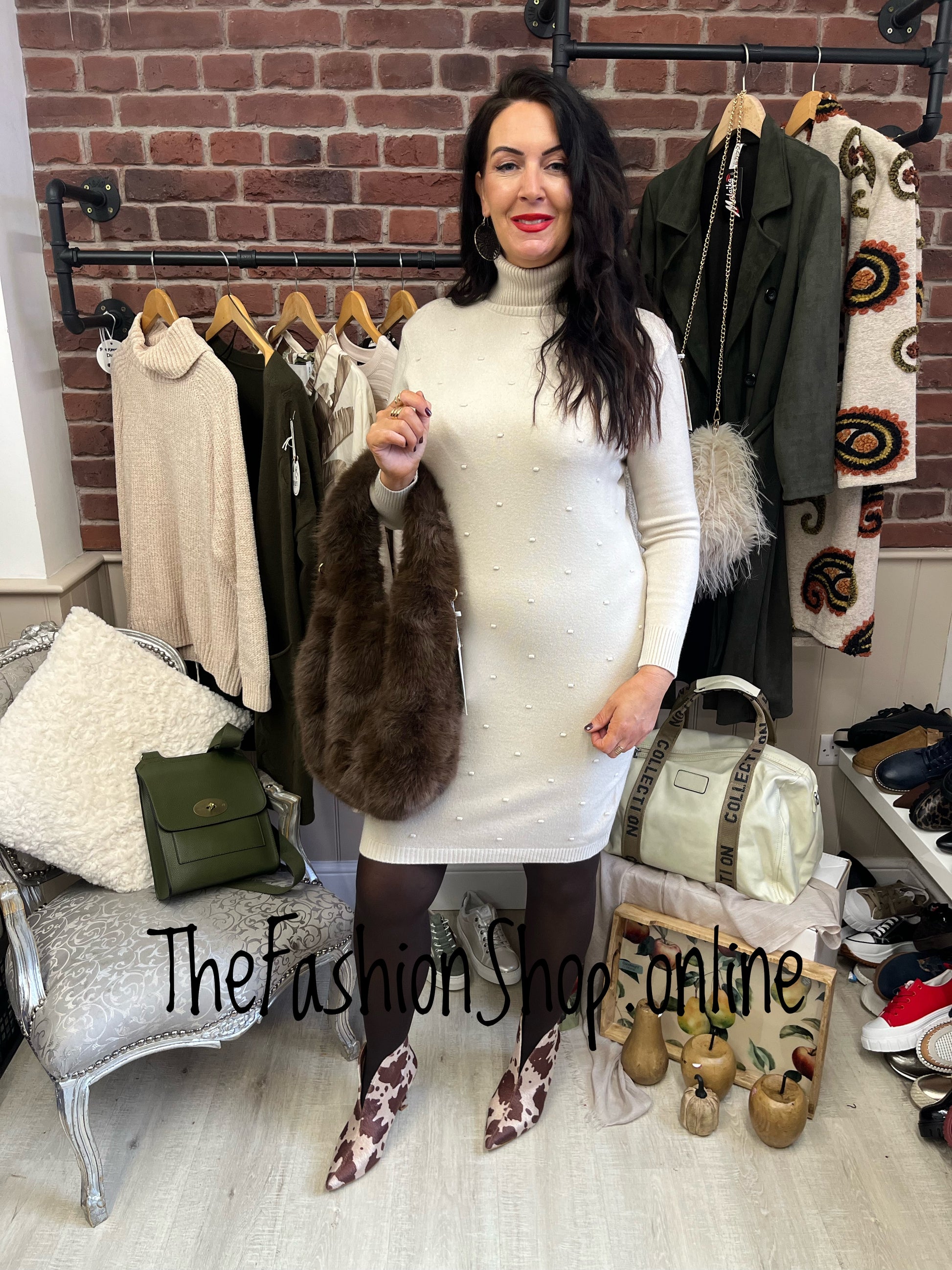 The Charlotte cream jumper dress offers a refined blend of comfort and timeless style. Crafted from soft, high-quality fabric, it ensures warmth and ease of movement, making it ideal for cooler seasons. Its neutral cream tone provides versatile pairing options, suitable for both casual wear and layered looks. Designed to flatter all figures, this jumper dress combines practicality with understated elegance for a sophisticated everyday wardrobe staple. It has a soft ribbed polo neck that matches the hem line and cuffs perfectly. The subtle dot work makes a wonderful finish.