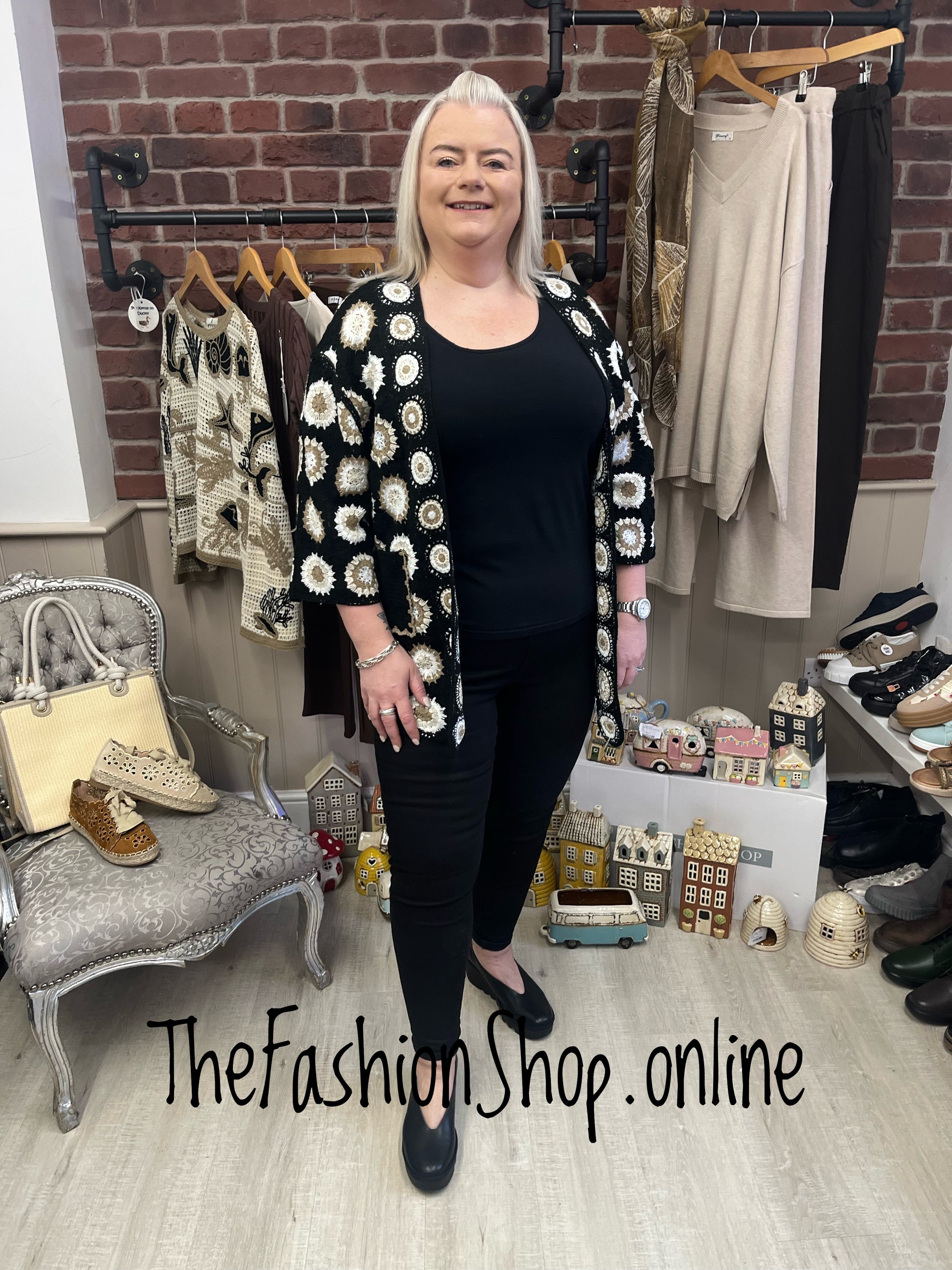 Elevate your wardrobe with this charming Emily black patterned crochet cardigan. Crafted from soft, easy-care 100% acrylic, it features intricate crochet detailing in a timeless black, camel and cream pattern. Perfect for layering over dresses or casual tops, this versatile piece offers comfortable coverage with a flattering length of 31" from shoulder to hem. Available for sizes 14-22, it's machine washable at 30 degrees for effortless maintenance. A stylish essential that transitions seamlessly from day to evening wear with 3/4 length sleeves for a stylish finish.