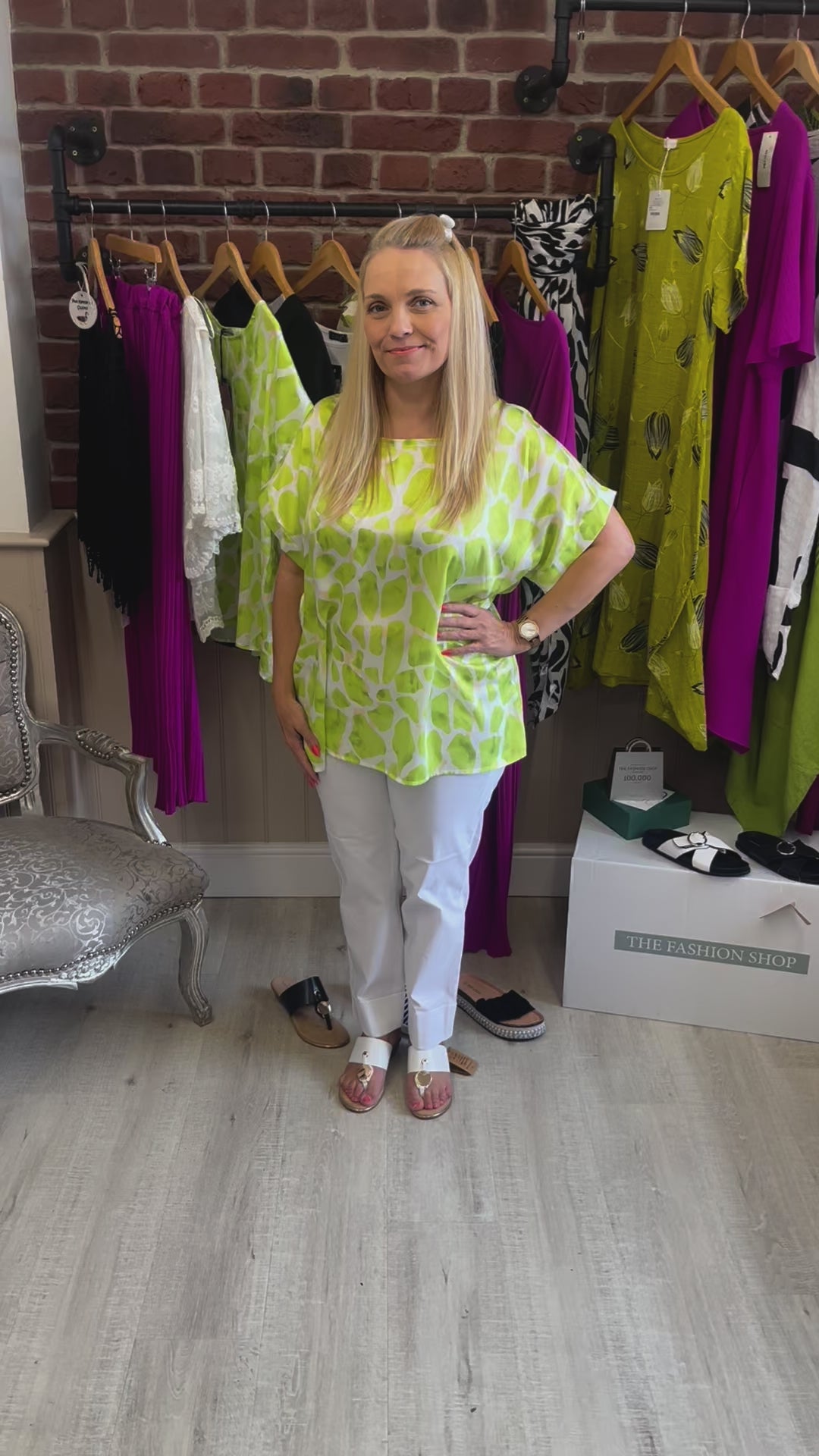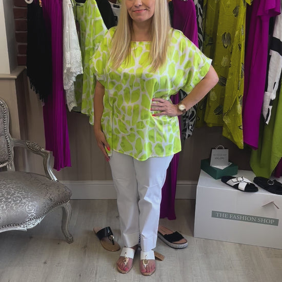 This fabulous top is striking in lime and white with a hint of beige detail. The giraffe print adds a quirky touch and worn with black, makes a wonderful statement outfit. With a silky feel and super lightweight, this top can transition with you through the seasons.