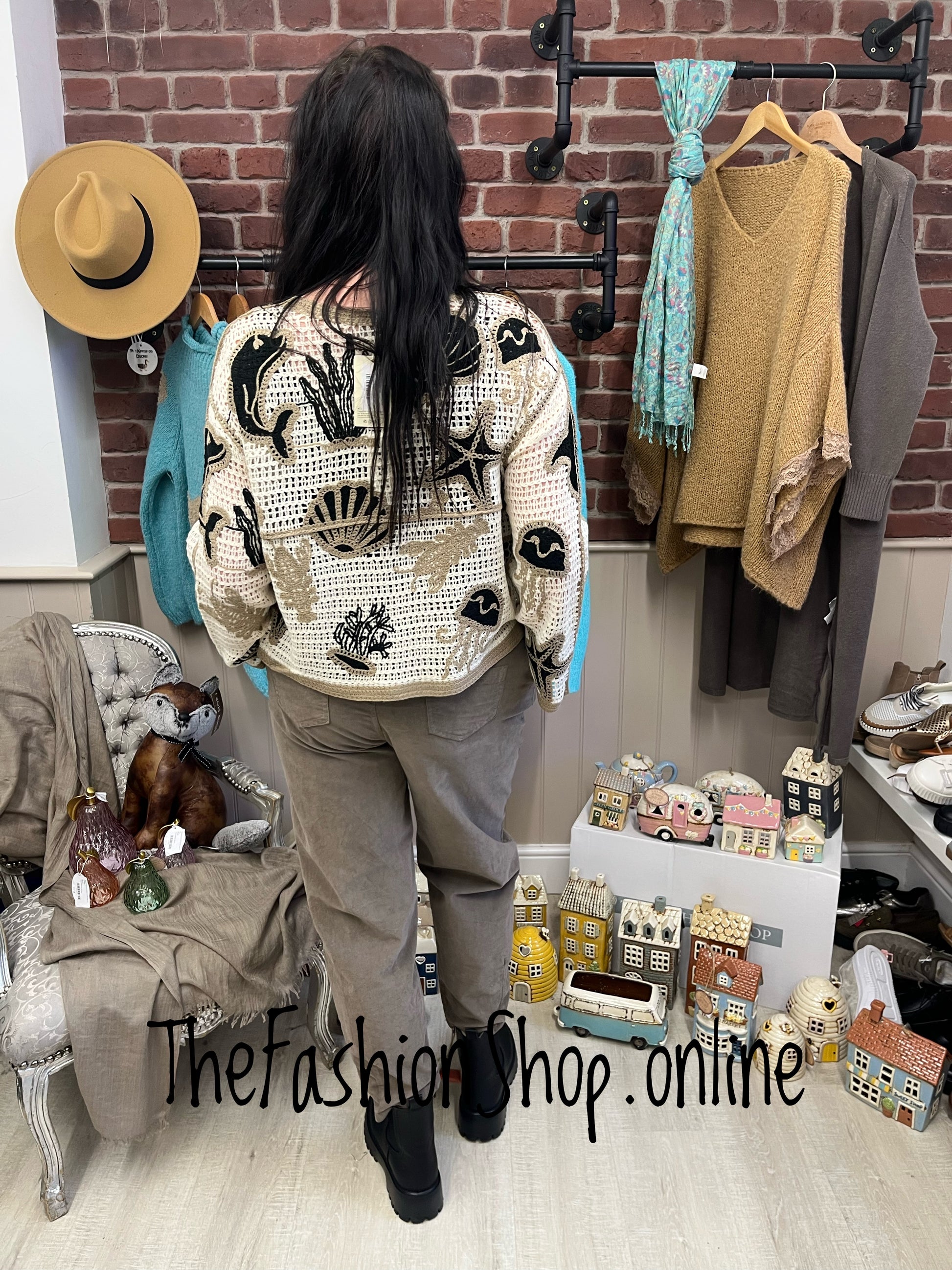 Crafted from premium crochet fabric, this Molly sealife layering top combines intricate ocean-inspired detailing with versatile styling. The delicate openwork construction allows for effortless layering over fitted basics, while the sealife motifs add visual interest and texture. Designed for sizes 8-14, this piece offers a flattering fit that transitions seamlessly from casual daywear to evening occasions. The breathable crochet weave ensures comfort throughout the day, making it an essential addition to any wardrobe seeking sophisticated layering options. In neutral tones of mocha and beige with black accents, it's perfect for easy styling through the warmer months.
