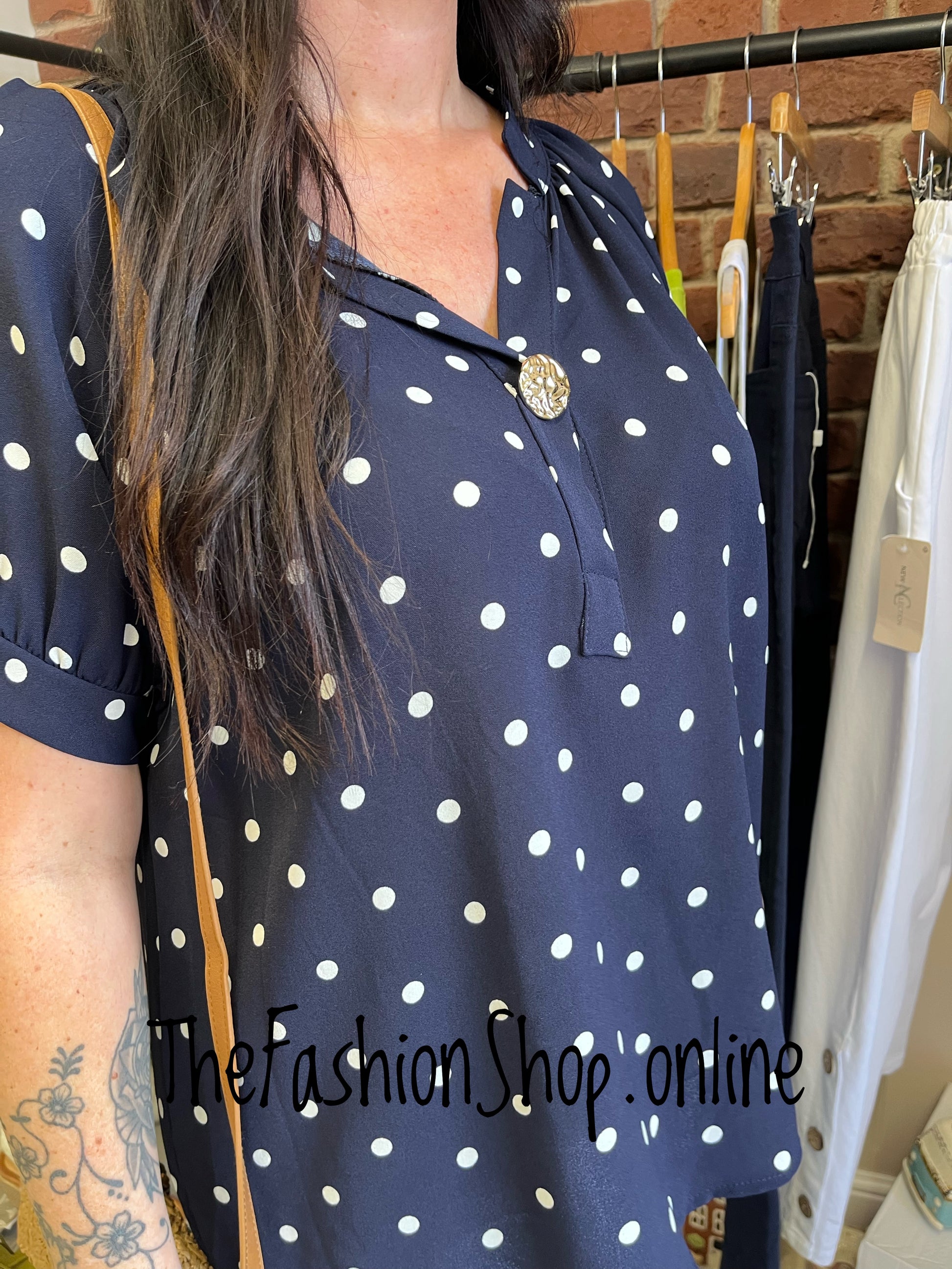 Step out with confidence in the Natalie navy and white spot button blouse. Crafted from 100% polyester, this easy-care top is designed for busy days and long wear, washing at 30 degrees and preserving colour and shape between wears.