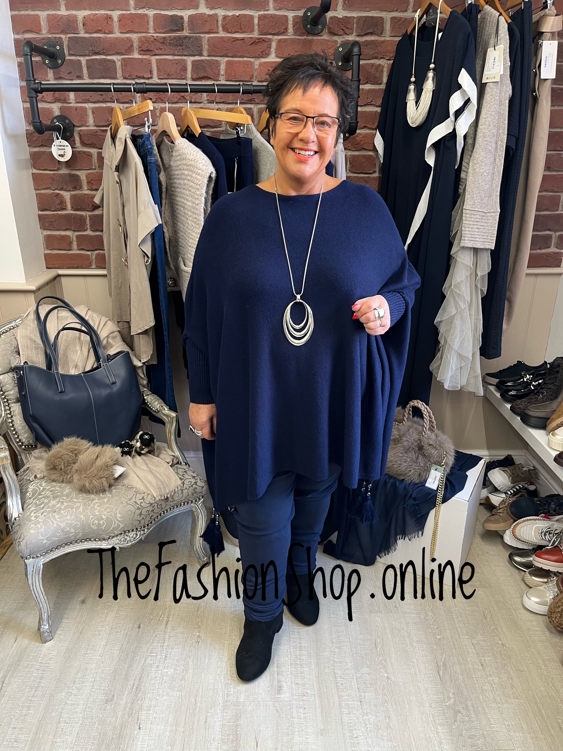 Navy is a classic choice which looks great paired with so many other colours. When you're wanting an extra layer but don't fancy a full on jacket or coat, then we think a poncho is a wonderful choice. This is a lovely versatile style made of 50% viscose, 28% polyamide and 22% modal it's a very soft knit. With long sleeves, the wrist has ribbing detail making for a lovely fit on the arm. This poncho has a simple slashed neckline and lovely tassels hanging from each corner, finished with lovely metallic finish grey beads. The tassels and beads add a little weight to the style so it hangs wonderfully. This poncho will fit size 12-26 and is machine washable.