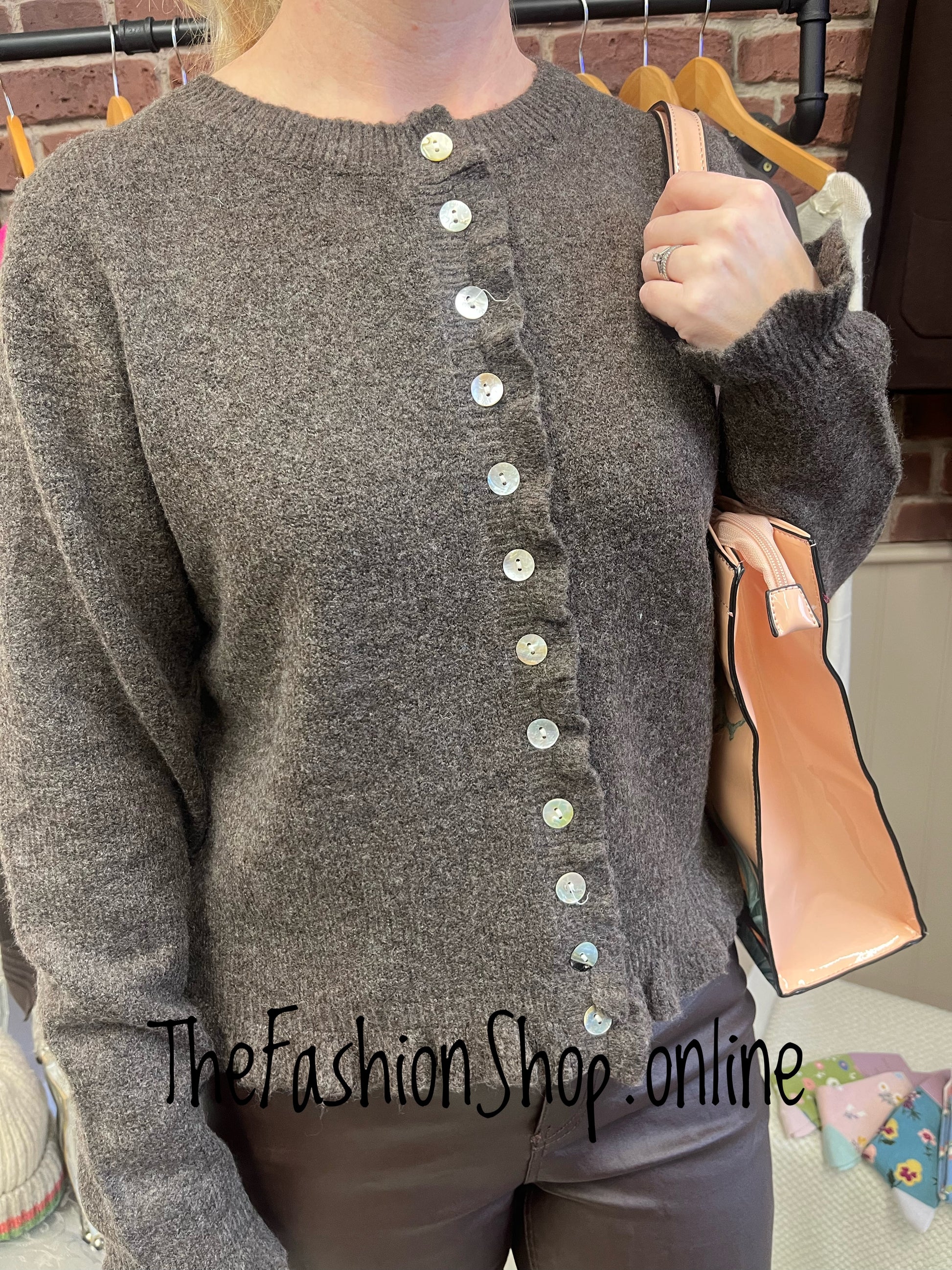 Paloma-Inspired Coffee Wool Mix Cardigan — Warm, Lightweight Comfort with Subtle Frill Detail