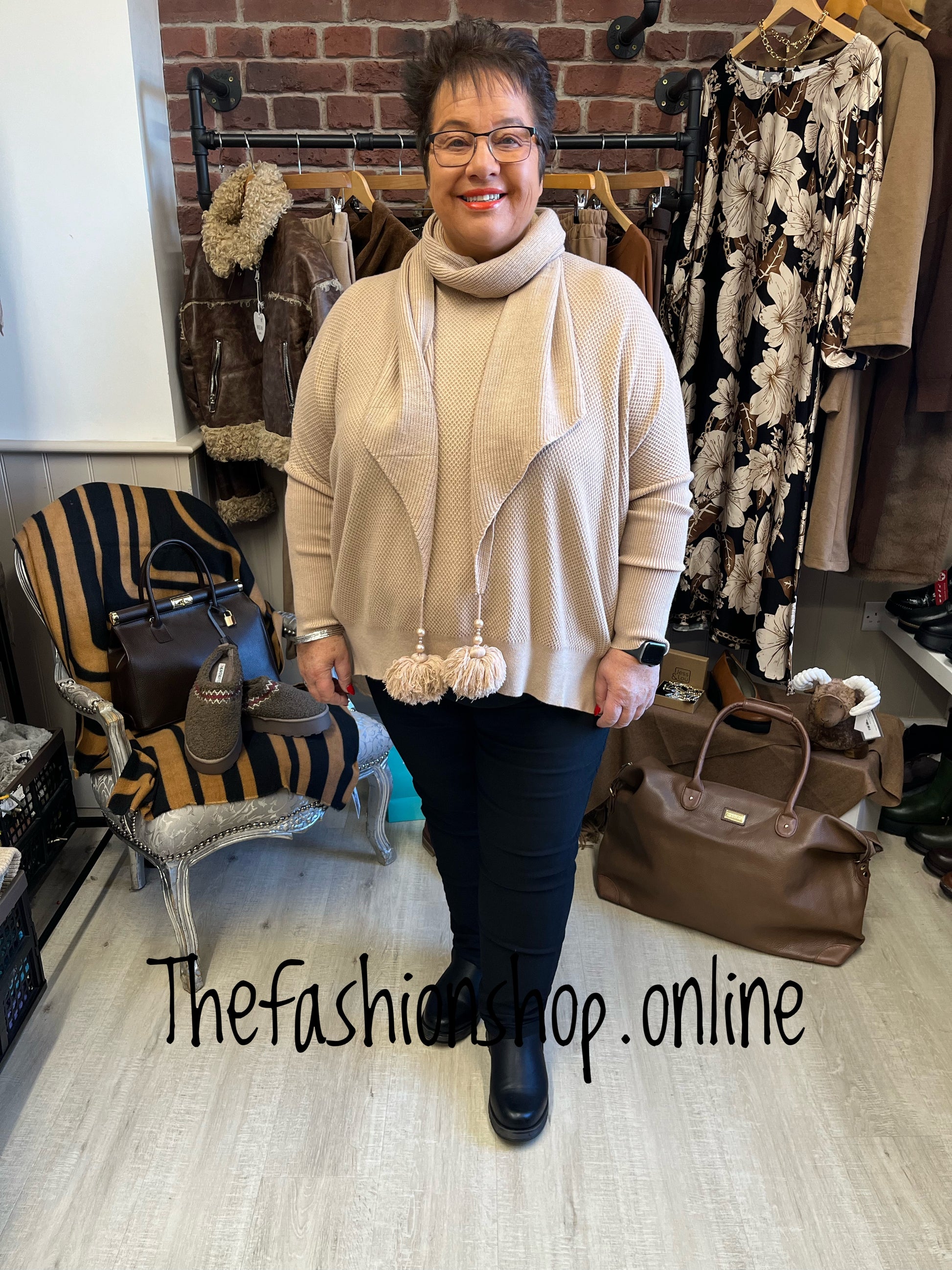 This beautiful quality jumper by Sarah Tempest has a waffle finish throughout and fully ribbed sleeves from the elbow down. The hem line is a slight high low with 4" side splits for added detail. This jumper also comes with a knitted scarf in the same rich camel colour and has a large pom pom on each end for a fun finish.